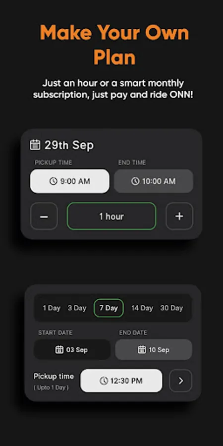 Just download & install the ONN Bikes rideshare app, and pick a ride of your choice from any of your nearest ONN Stations. Choose any duration you want from our affordable hourly, weekly and monthly plans and have fun using your own bike on your own terms.