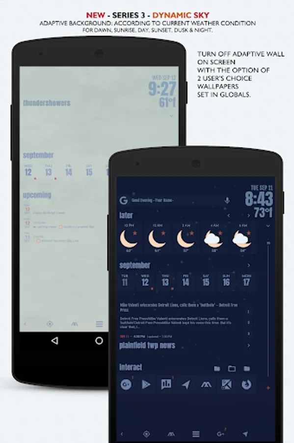 • Adaptive Background: according to current weather condition for dawn, sunrise, day, sunset, dusk & night.