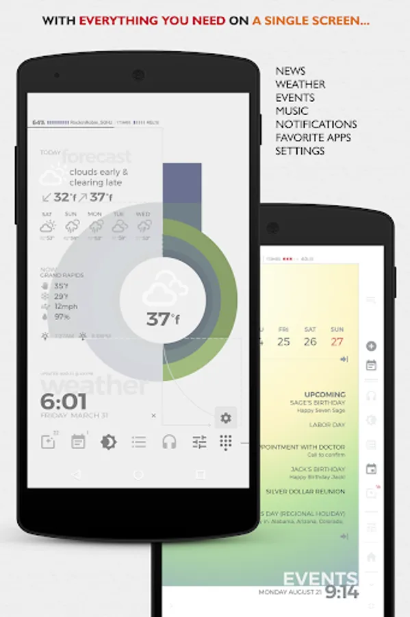• Frequents, Events, Weather, News, Music, Settings & Home all on one screen
