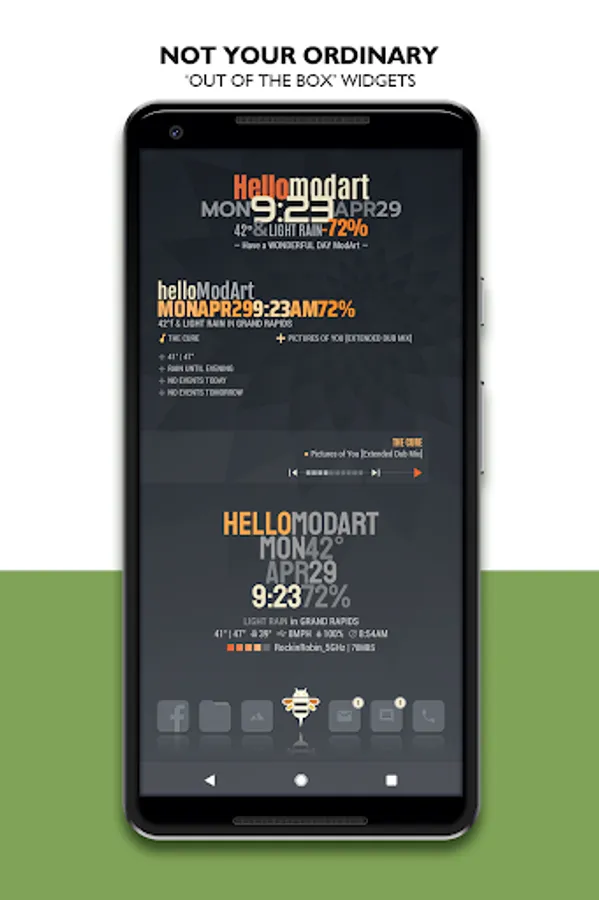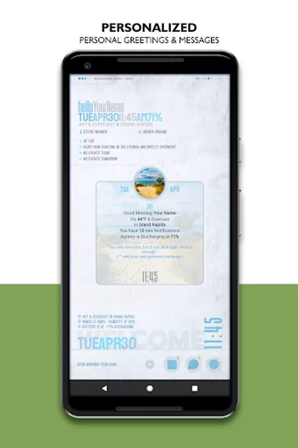 ● 9 General Purpose: Personal Greeting / Date / Time / Weather / Battery / Music / Other... depending on widget