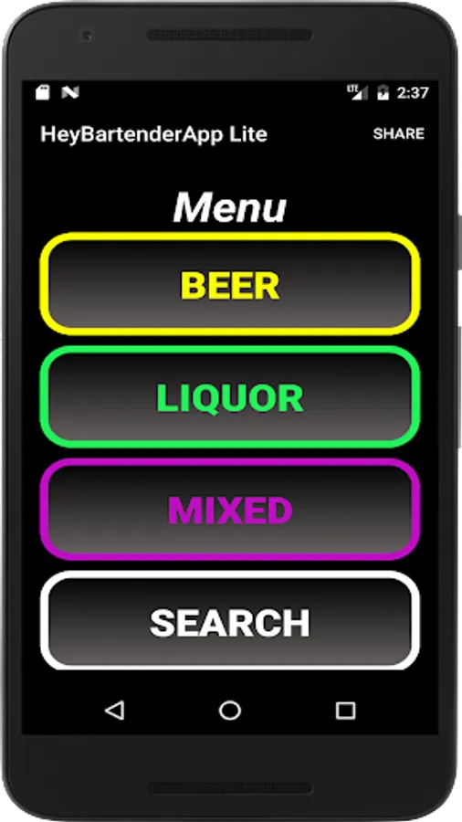 Our mission was to create a simple, quick, and easy interface to maximize your time of having fun. Big buttons along with clear pictures makes it easy to find what you’re looking for in a maximum 3 screens. Simplicity is what Hey Bartender App is all about.