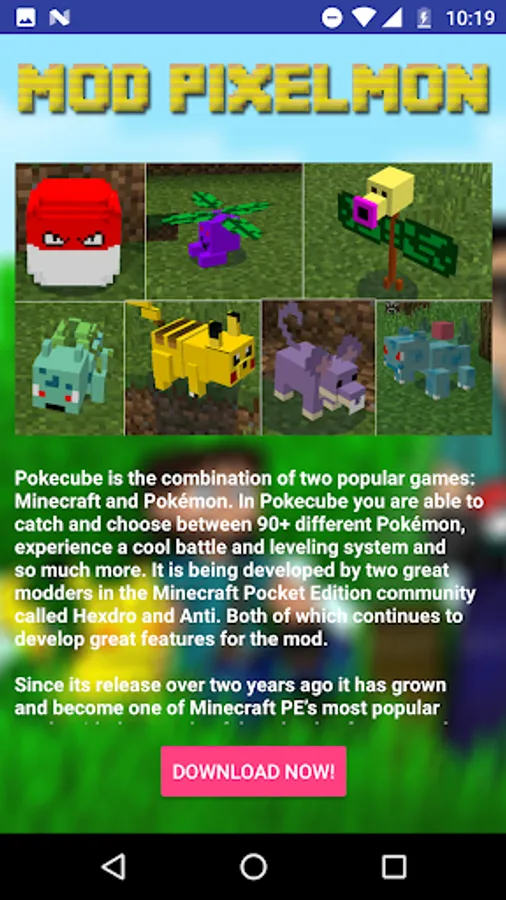 Mod Pixelmon PE for Minecraft PE is the funniest mod that combines two popular games. Start your own adventure and train your pets to start battle on Pixelmon PE. Complete your Pixel-Dex and catch all!