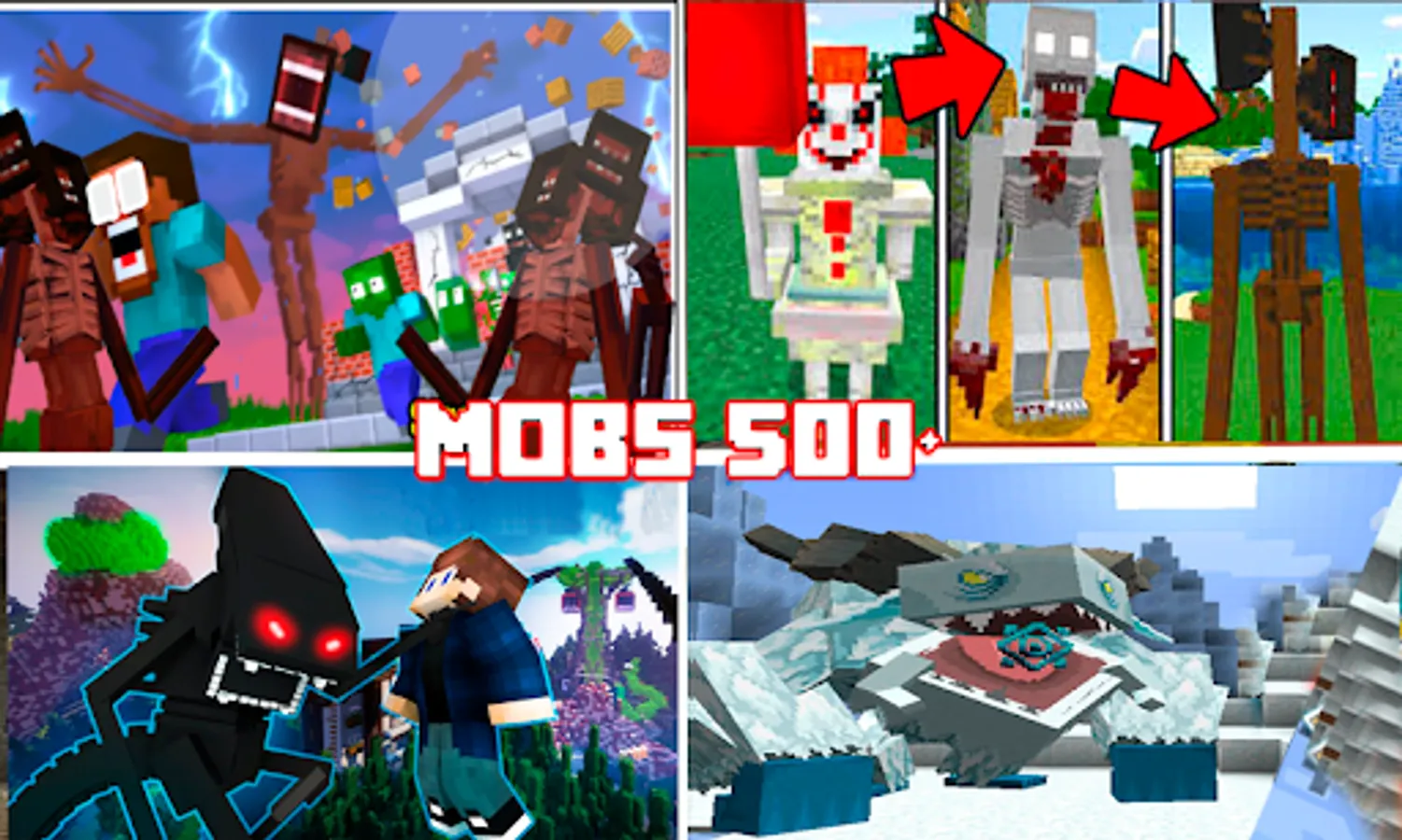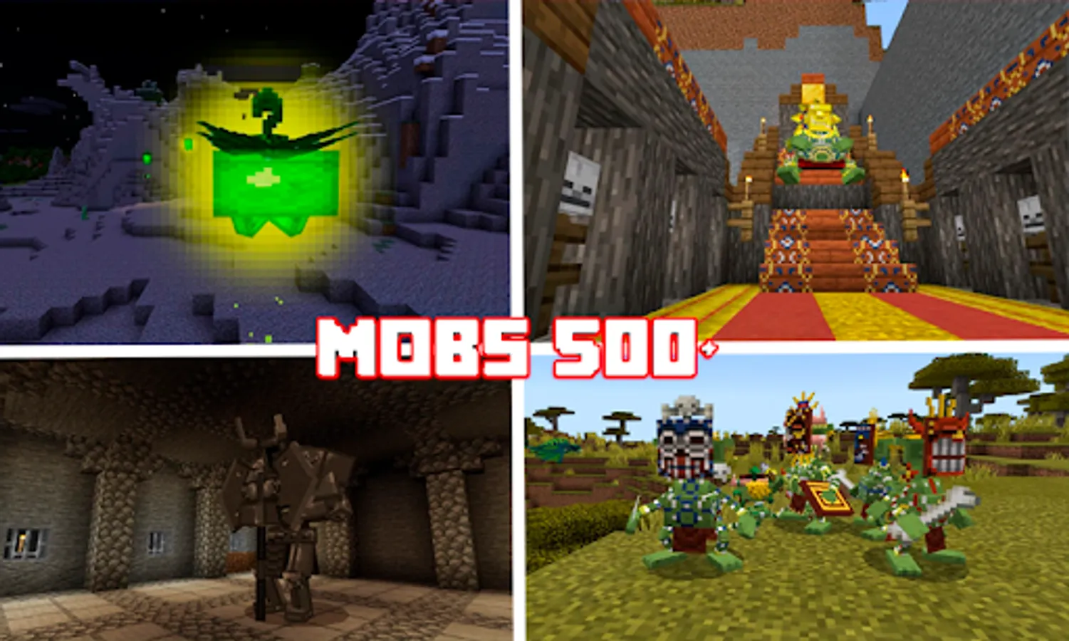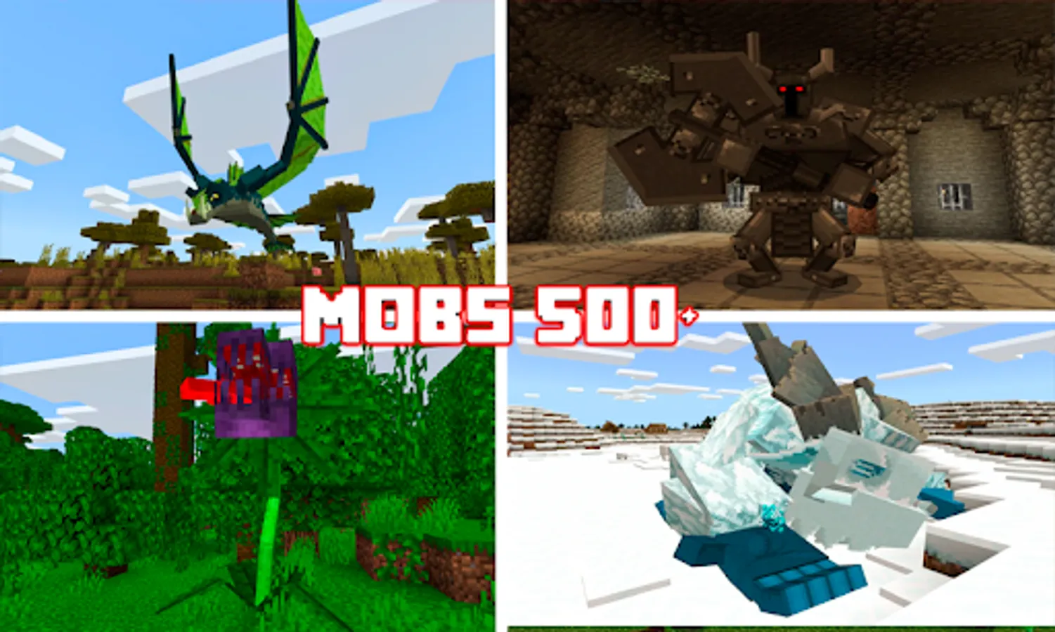Mobs Mods 500+ for MCPE is a new collection of mods and add-ons with various mobs and bosses for your minecraft world.