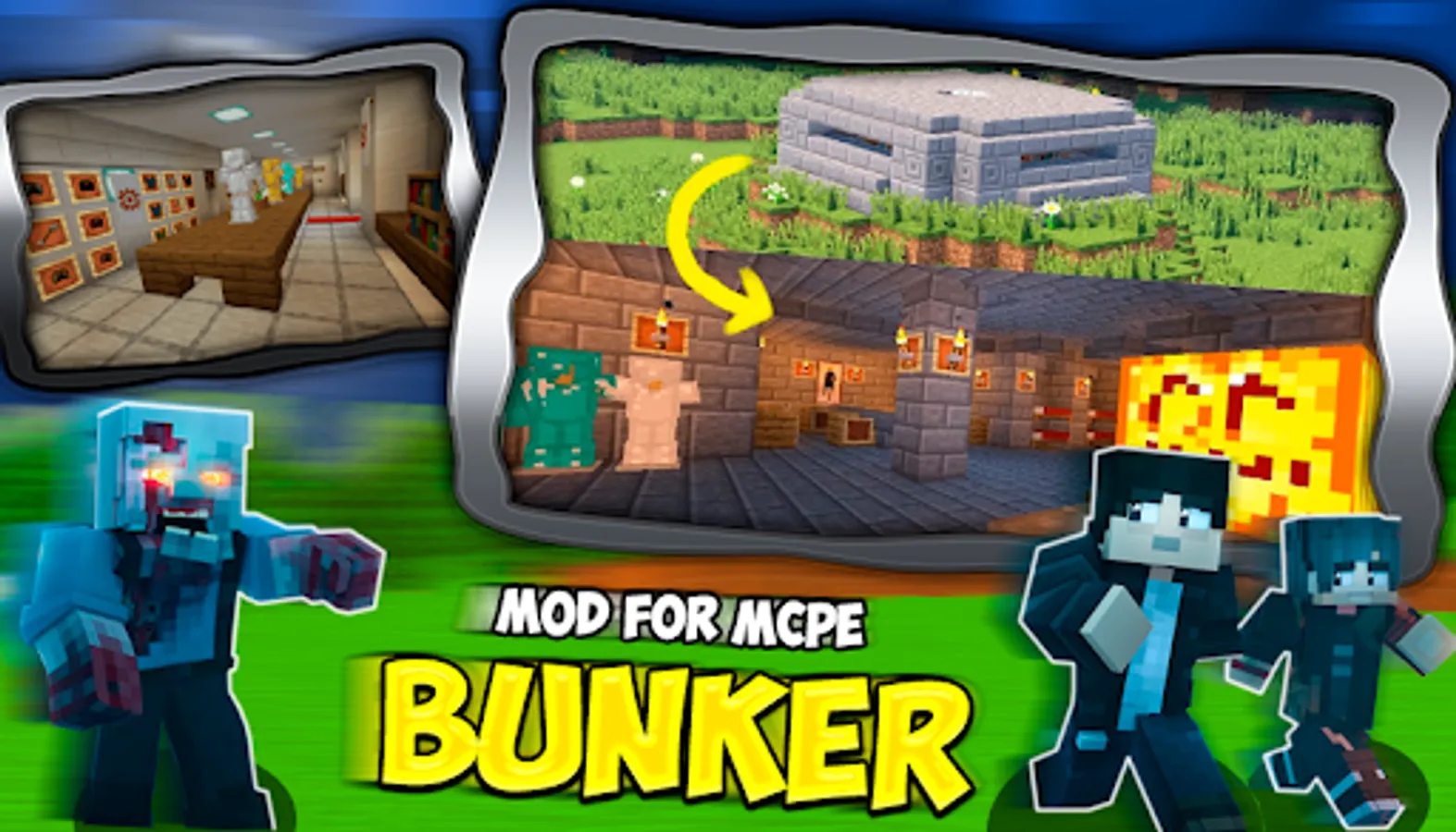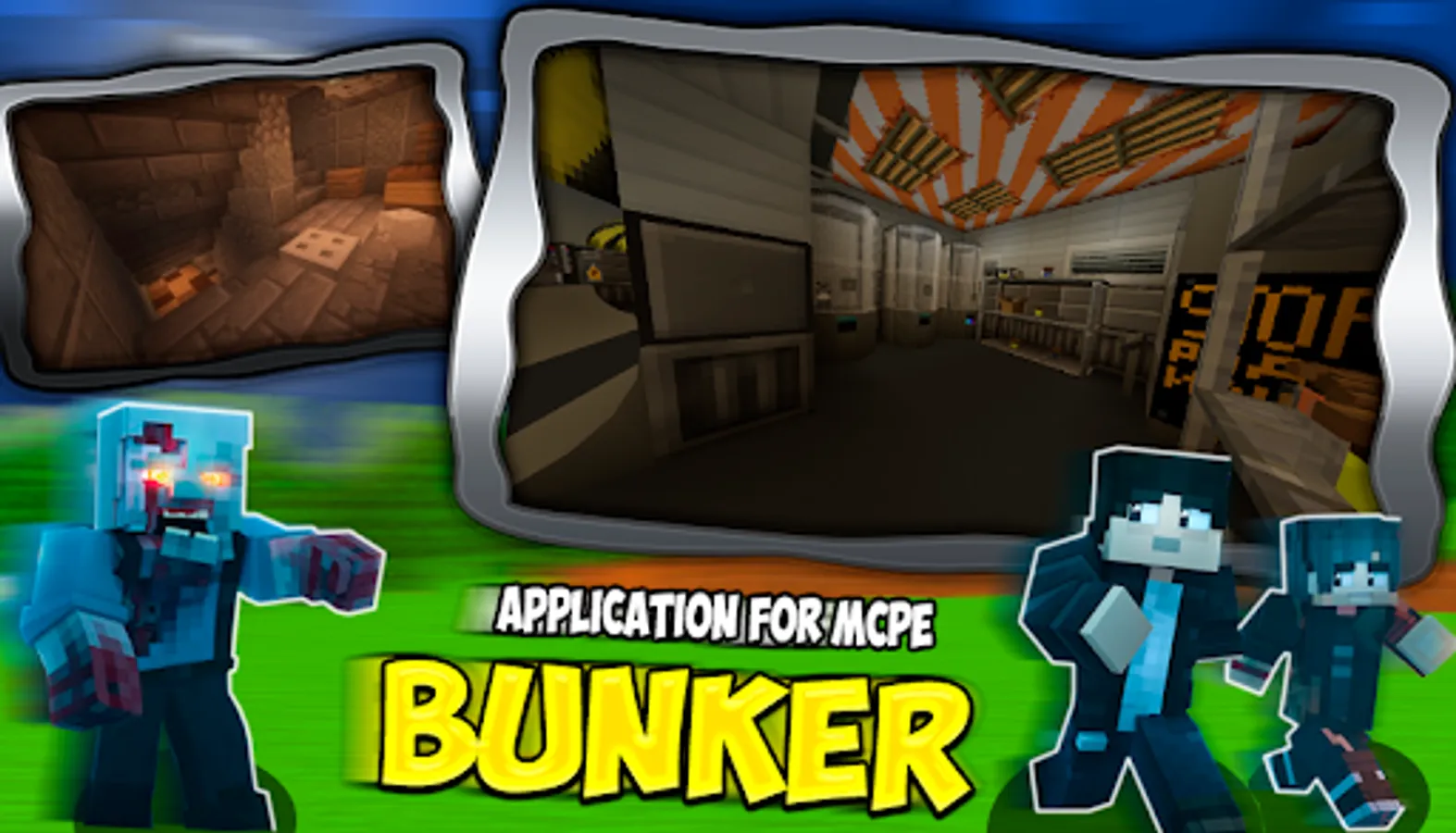 By installing our apps, mods/add-ons, maps, mini-games and cool skins, you will be able to build a brand new zombie apocalypse survival bunker in your pixel world, which was also added to Minecraft with our free mod.