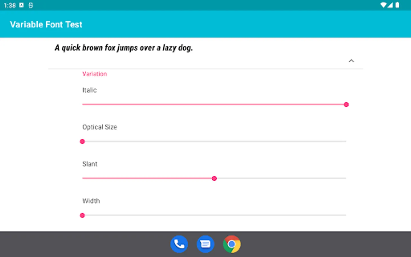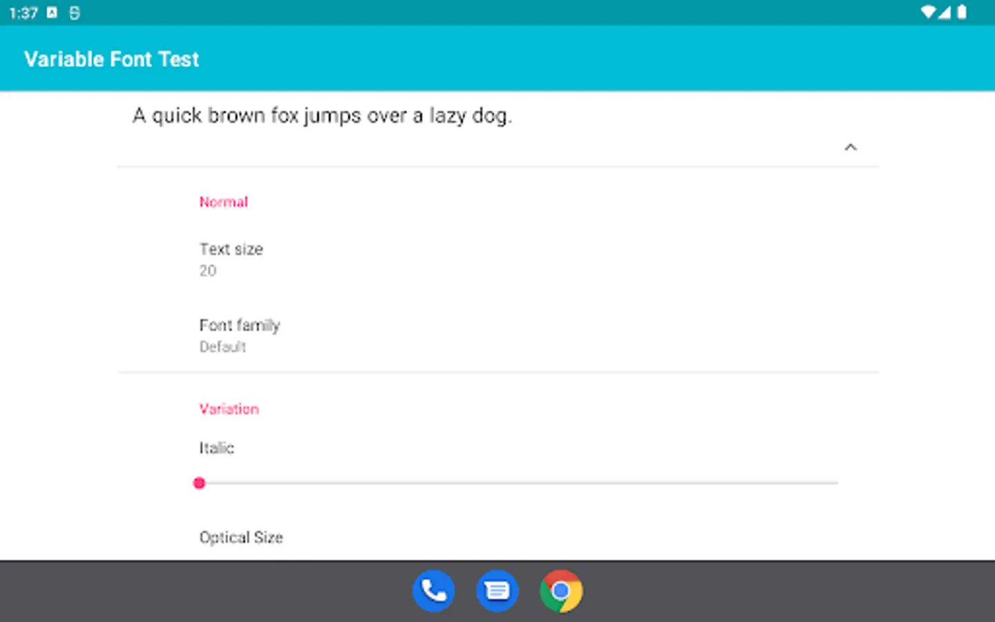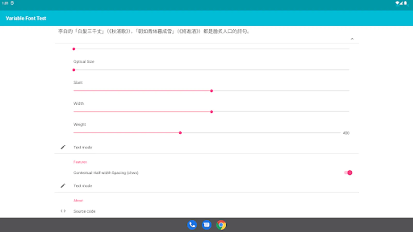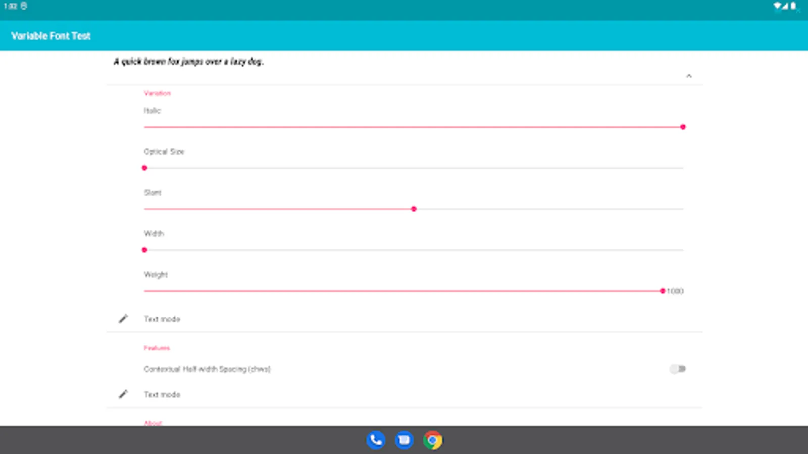 This is a app allow you to experience the feature of variable font and font feature. It could use font built in Android or from file by file manager.