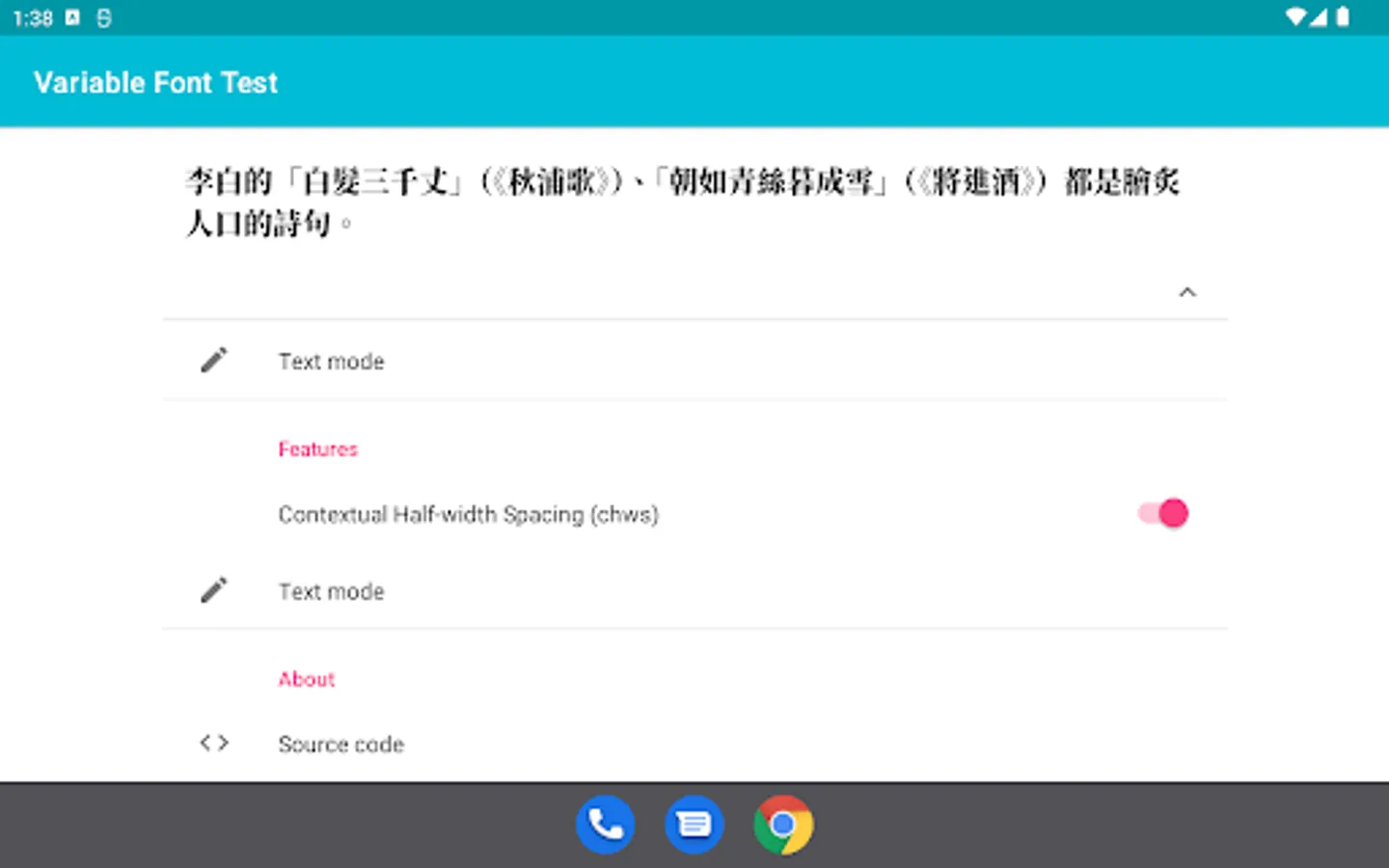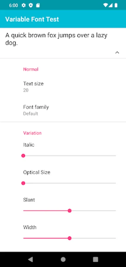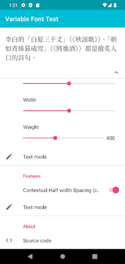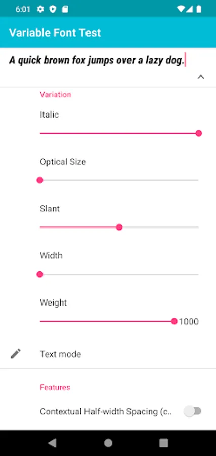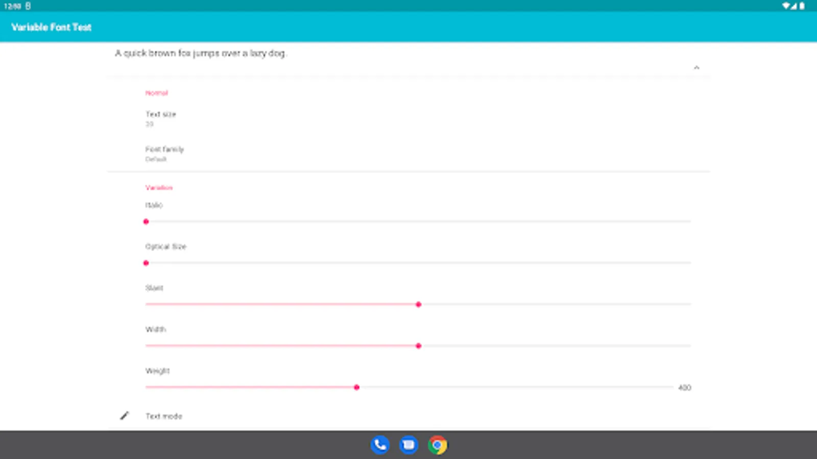 This is a app allow you to experience the feature of variable font and font feature. It could use font built in Android or from file by file manager.