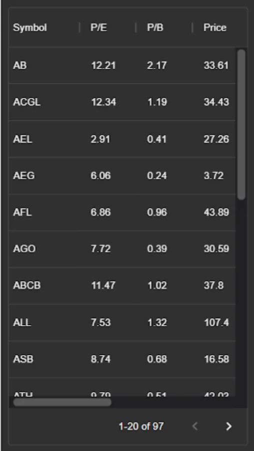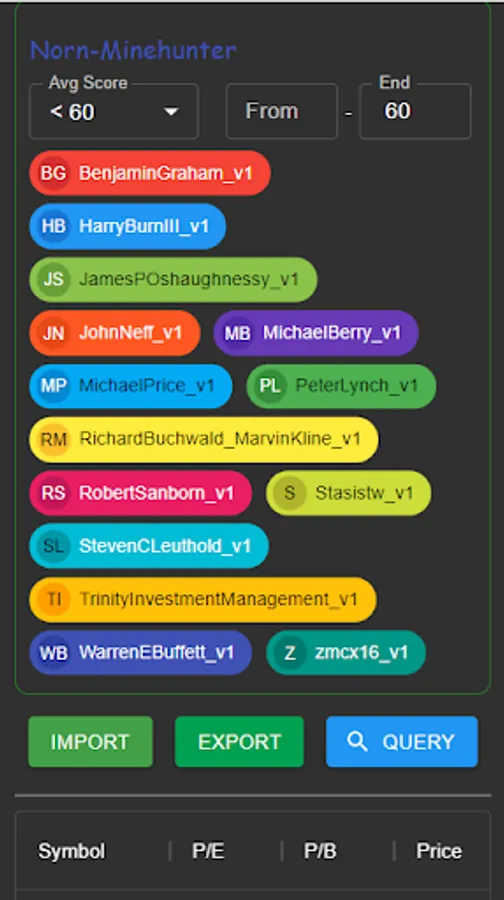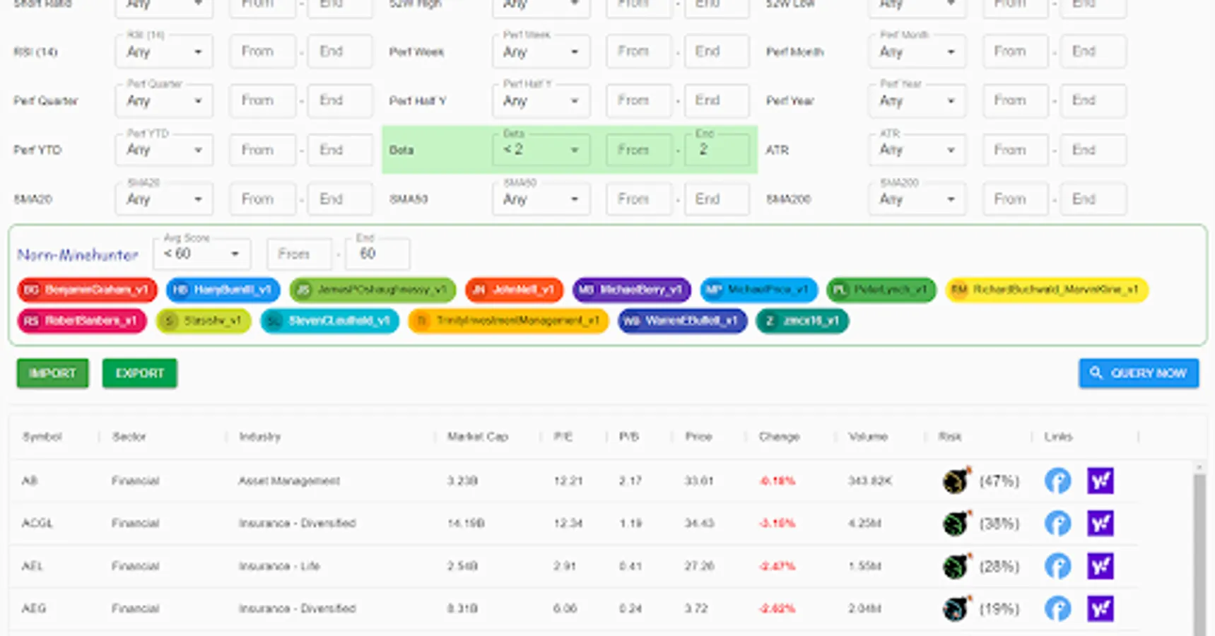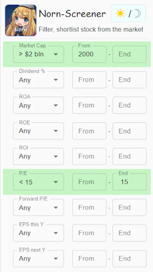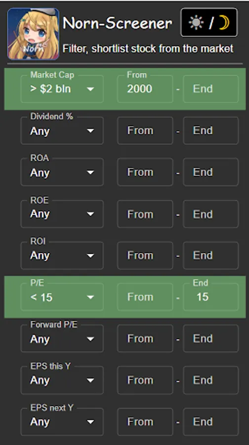 Norn-StockScreener is an US stock screener. You can use it to scan and filter instruments based on market cap, dividend yield, ROE... base argument to get your target stocks, it also support some popular investment master's stock tactics to find valuable stocks.