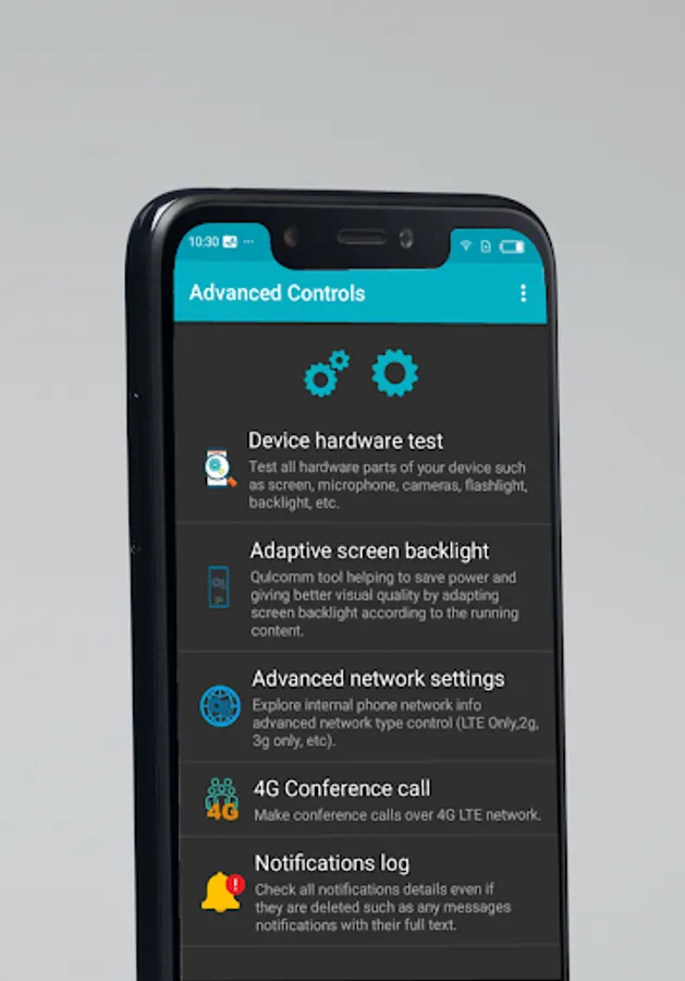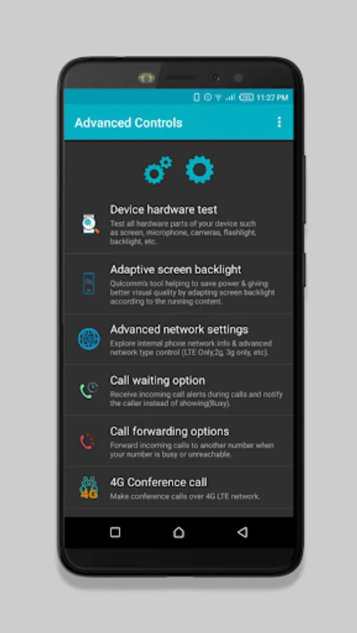 Advanced controls aims to let you get use of some internal helpful functions on your which are hidden by default such as device hardware test, more network settings, 4G conference calls, etc.
