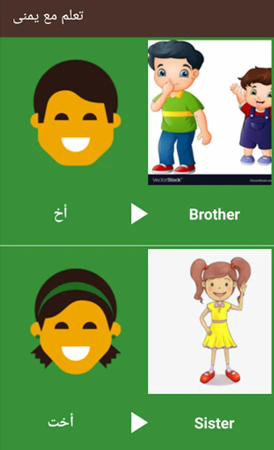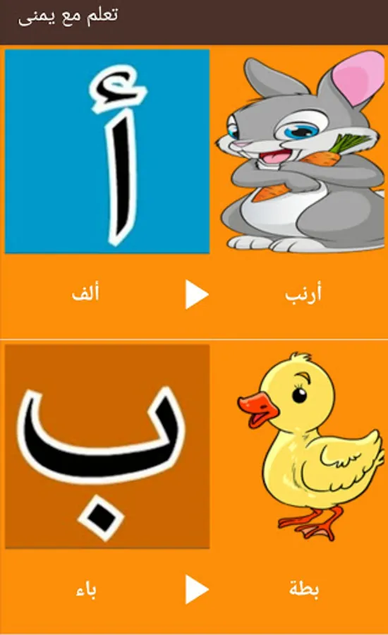 There is a section for Arabic letters, a section for English letters, a section for numbers, a section for the family, a section for colors