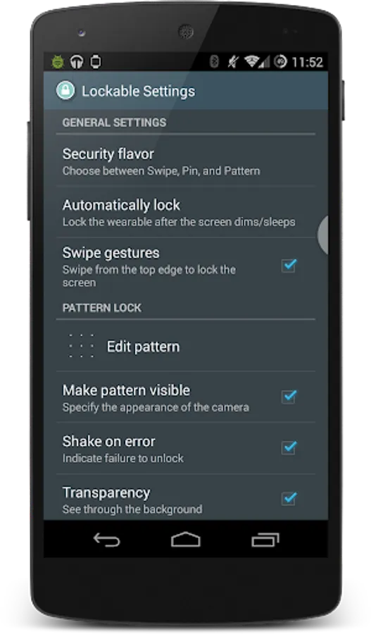 The PIN and Pattern unlock makes Lockable the optimal, secure, and configurable lock screen solution for Android Wear.