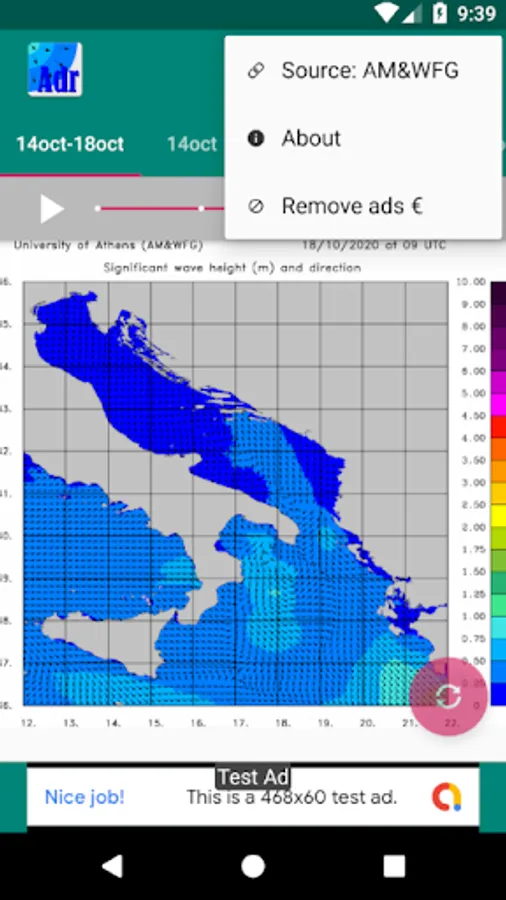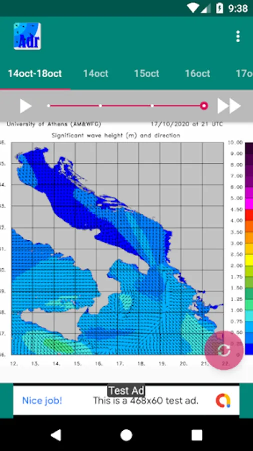 One of the research activities of the group is related to wave modelling, which is implemented with modelling product WAM system. It is a state of the art wave analysis and prediction model with some unique capabilities. WAM modelling results are various wave characteristics (wave heights, period, energy) and are calculated daily. Results are presented as images with defined color scale. Images are updated every day usually around 5:30 AM UTC on their website. Nevertheless, animation is updated around 6:00 AM UTC in the application.