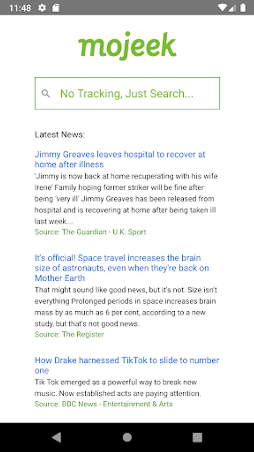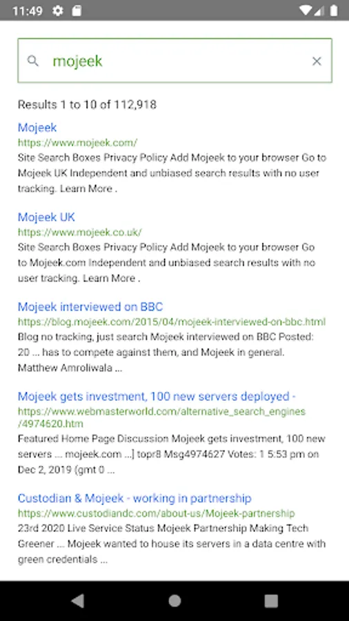 Our app provides an on-device version of the Mojeek search engine, which includes the following features:
