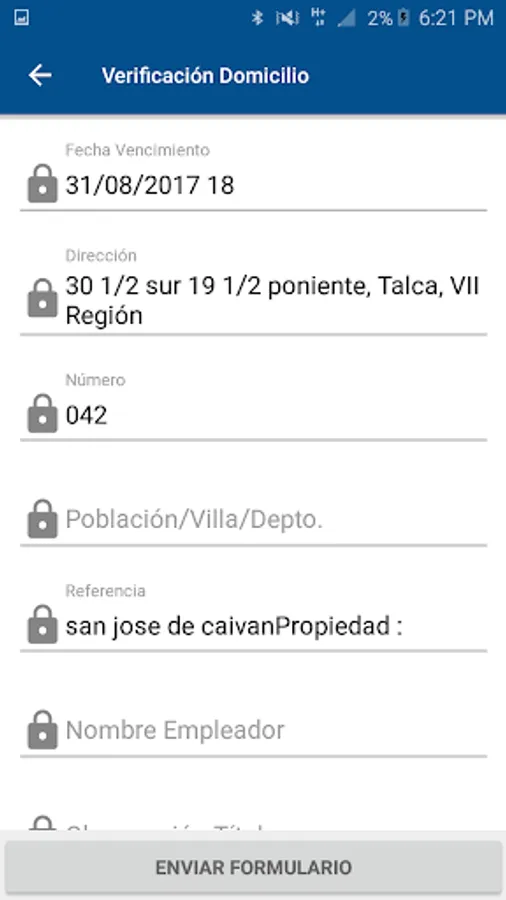 This application allows inspectors to generate and send the Address Verification Form, with the information corresponding to the type of construction, adjoining street, type of road and type of urban area, in addition to adding an observation and photos of the address, in this way facilitate interaction and dynamism when completing the form.