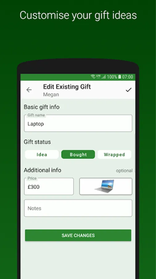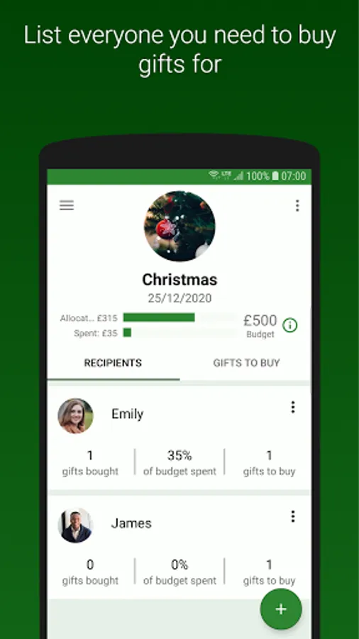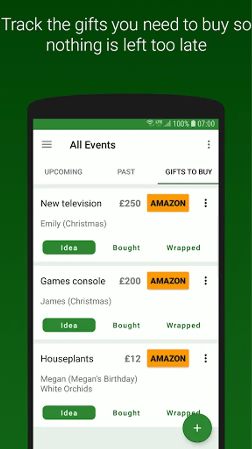 ☆ Add gift ideas to recipients, then mark them as bought or wrapped to manage your progress.