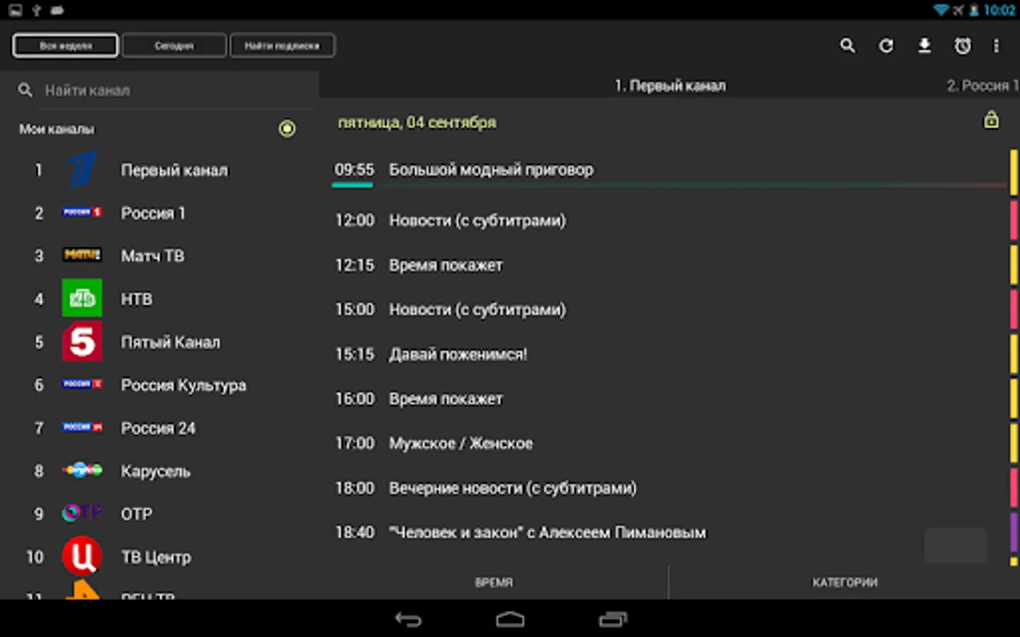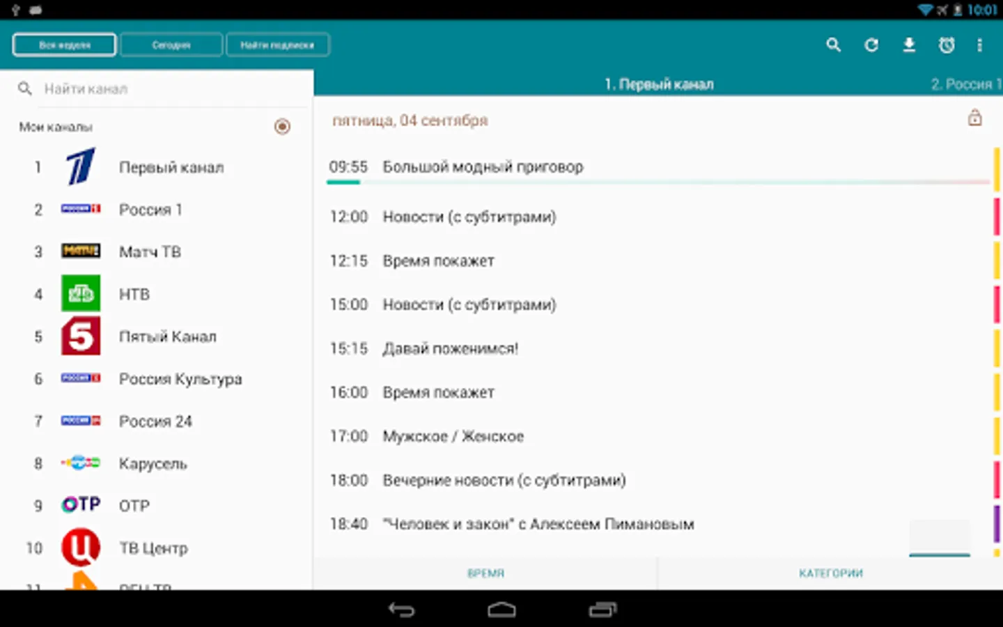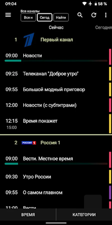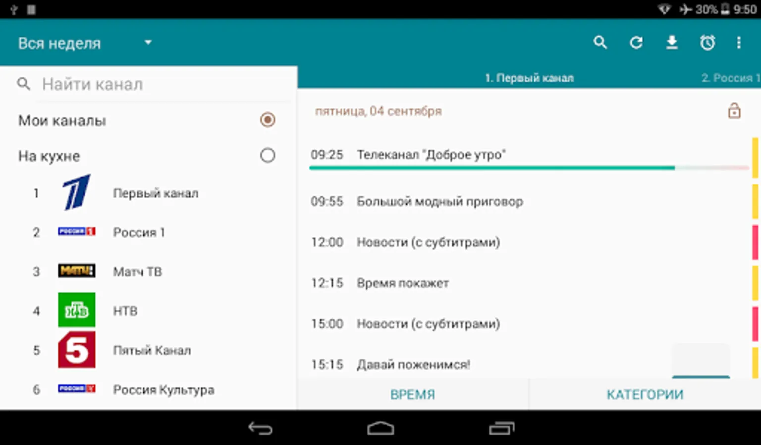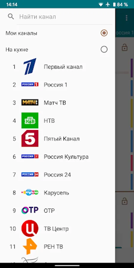 The application supports several separate channel lists, which you can quickly switch between on the main screen.