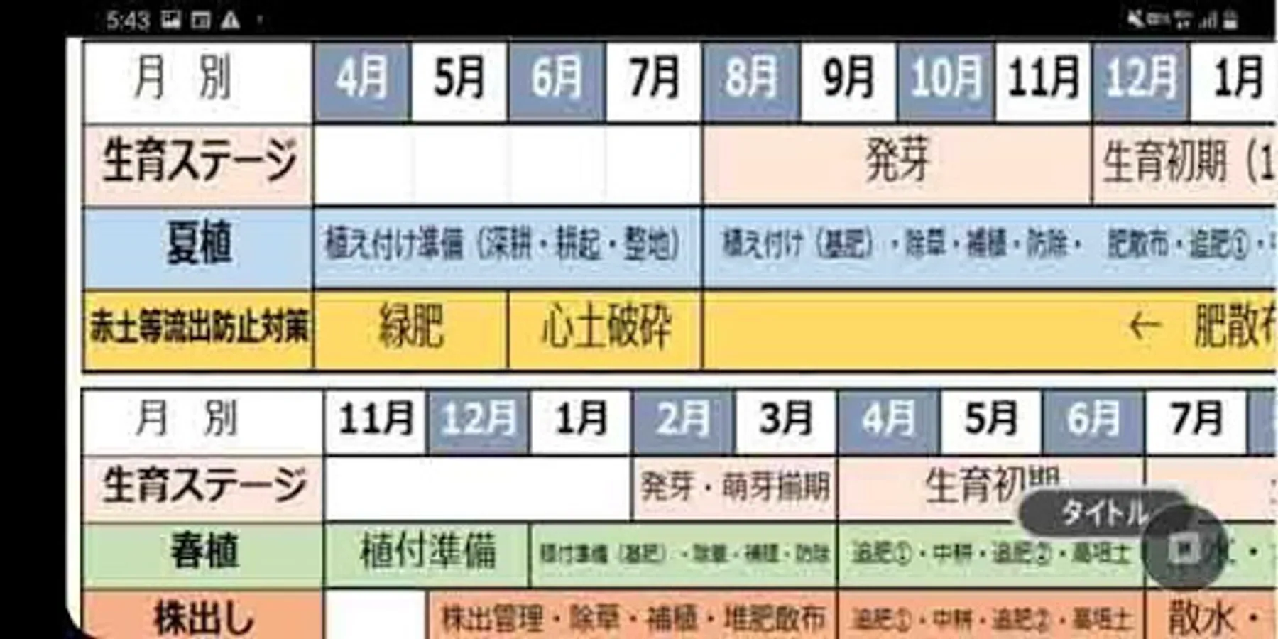 Cultivated koyomi is displayed in an image so that the timing of sugar cane spring planting, summer planting, and stocking can be seen in the calendar. You can see what to do each month.