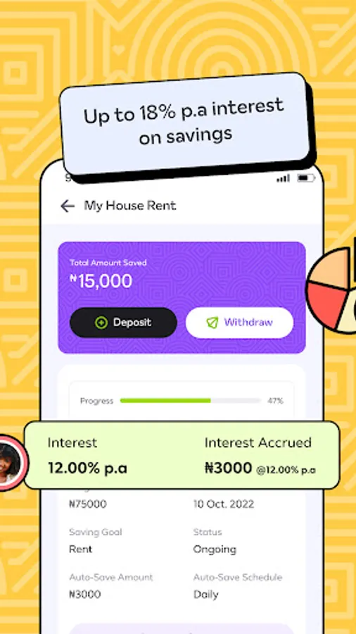 You can also save with regular deposits, set up savings goals with up to 18% interest per annum, and track your progress. Our app's security features make sure your money is safe and secure.