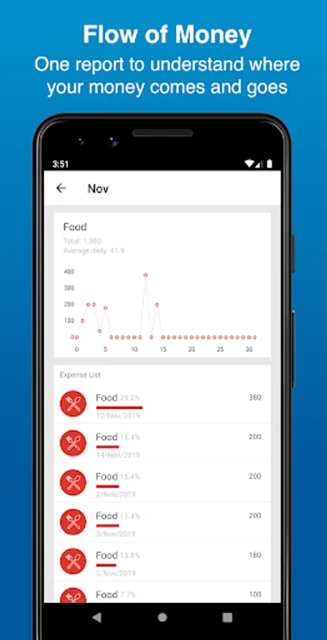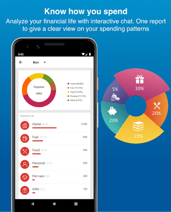 Know how you spend - One report to give a clear view on your spending patterns. Understand where your money comes and goes with easy-to-read graphs. Expense & income by time and category.