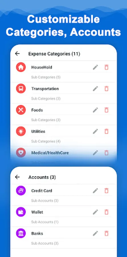 Our app allows you to create sub accounts and sub categories. You can disable sub categories and sub accounts in settings if you do not need it.
