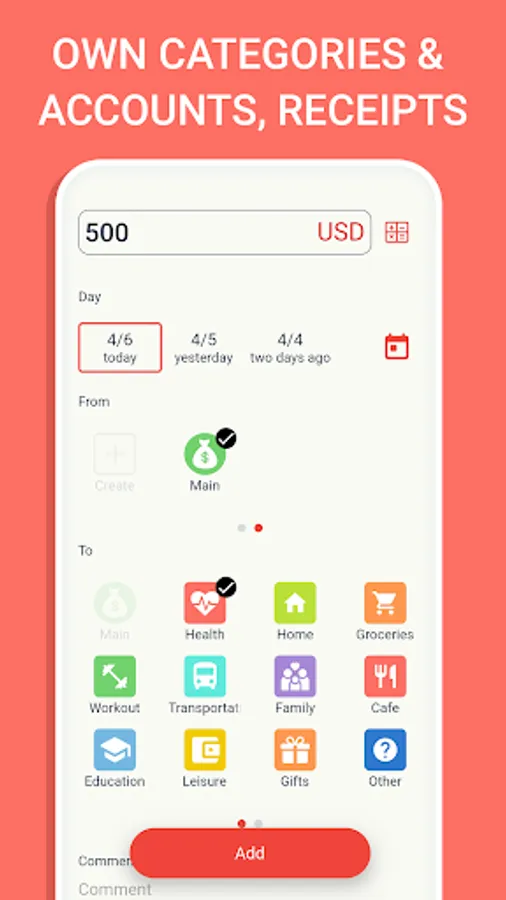 With an intuitive interface the process of adding expenses and revenue will be fast: fill in only key information with just a couple of taps, or add such further details as comments or photos of the receipt to the transaction.