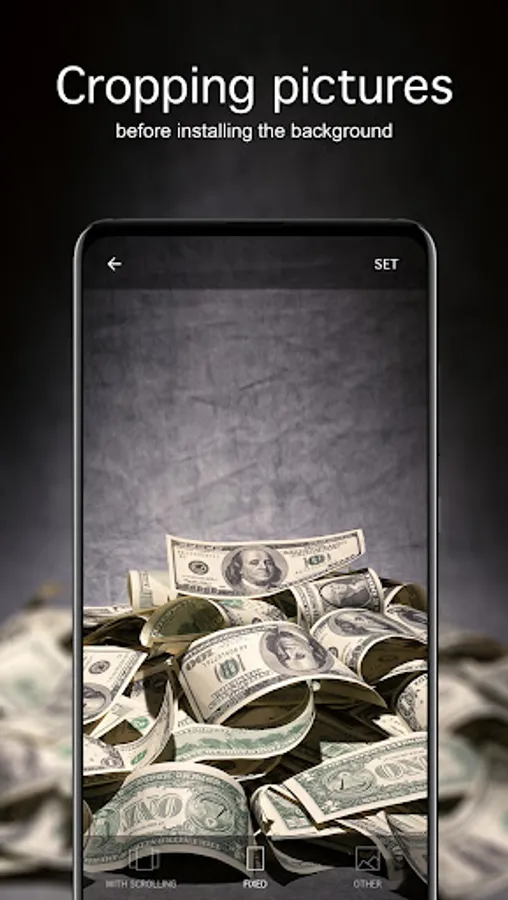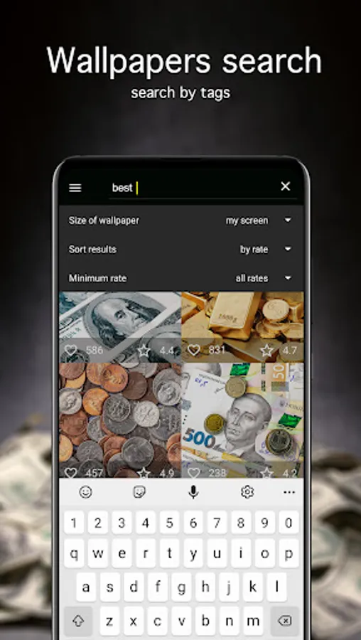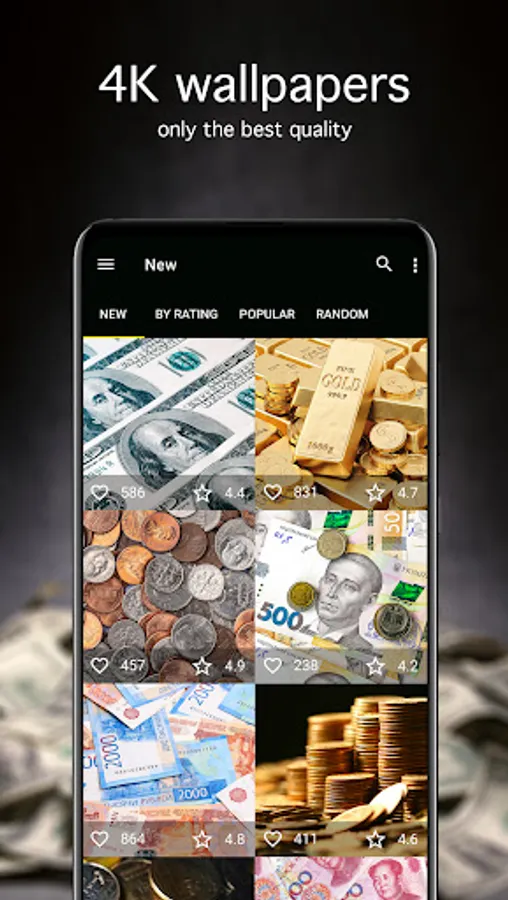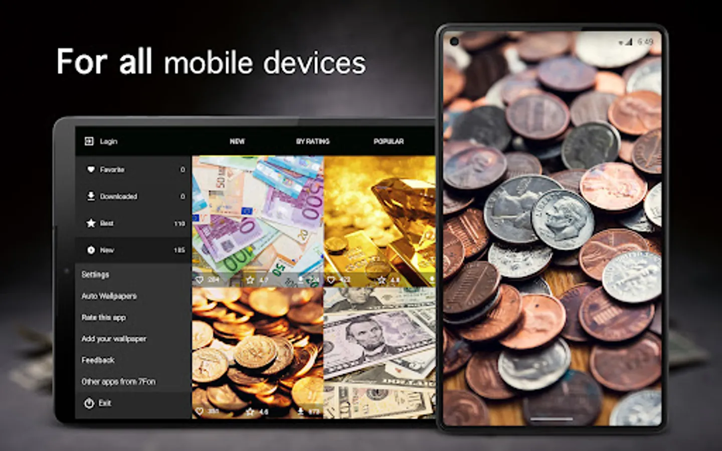 All the money wallpaper undergoes a strict filtering by the publication, which guarantees excellent quality of the pictures. Wallpapers are selected individually for each device. You will be presented with only money backgrounds that will perfectly look like a wallpapers on the screen of your phone or tablet. This application contains wallpapers with dollars, euros, various coins and cryptocurrency (Bitcoin, Ethereum, etc.)