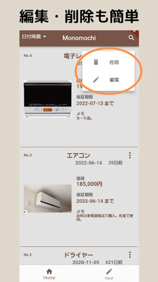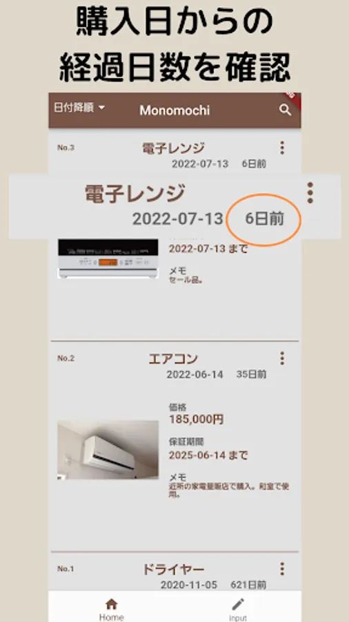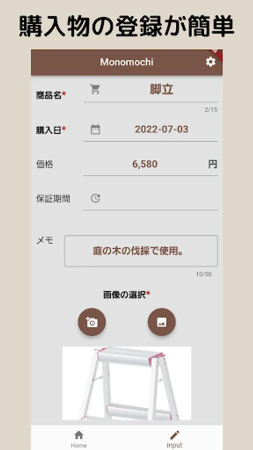 -You can register the product name, purchase date, price, warranty period, photo, and memo of the purchased product at once.