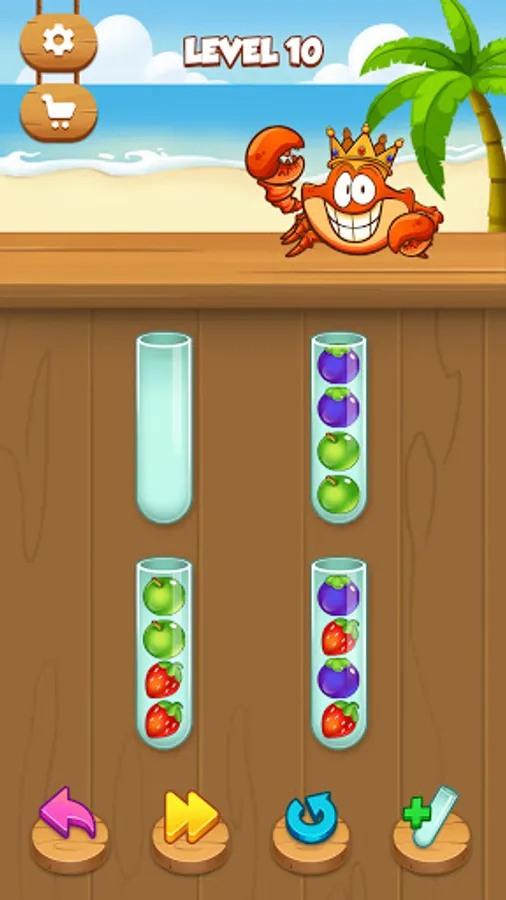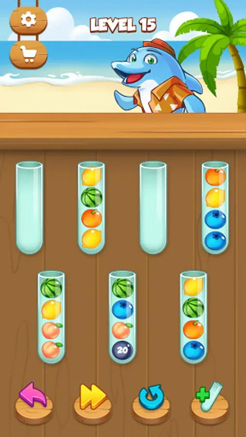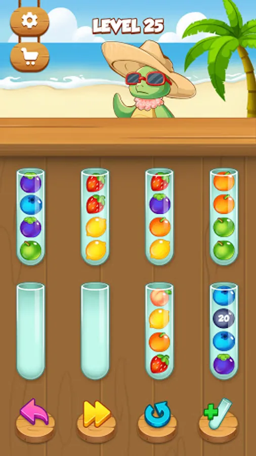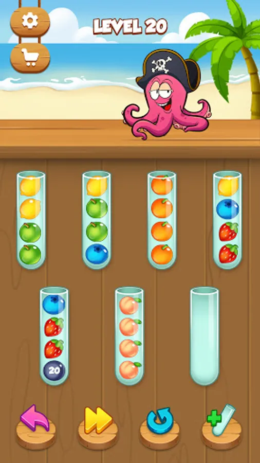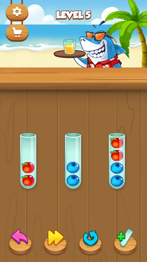 On the coastal line of the Pacific Ocean, where the sun is shining sparkling on the sand lies a small but cozy drink truck. Nonetheless, this drink truck serves very special customers of the ocean: sea animals like sharks, octopus, etc. Your mission in Fruit Ball Sort is to make smoothies for the dear sea animal customers by puzzling and sorting the correct fruit tubes. This might sound so similar to other old and outdated ball sort puzzle games. However, don’t be reckless so as not to fall into the trap of the boom balls and the mysterious question ball each level.