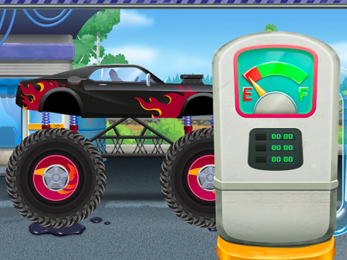 Fuel your monster truck at a gas station. Just insert a pump nozzle and tap multiple times on the pump to fill up the petrol tank.