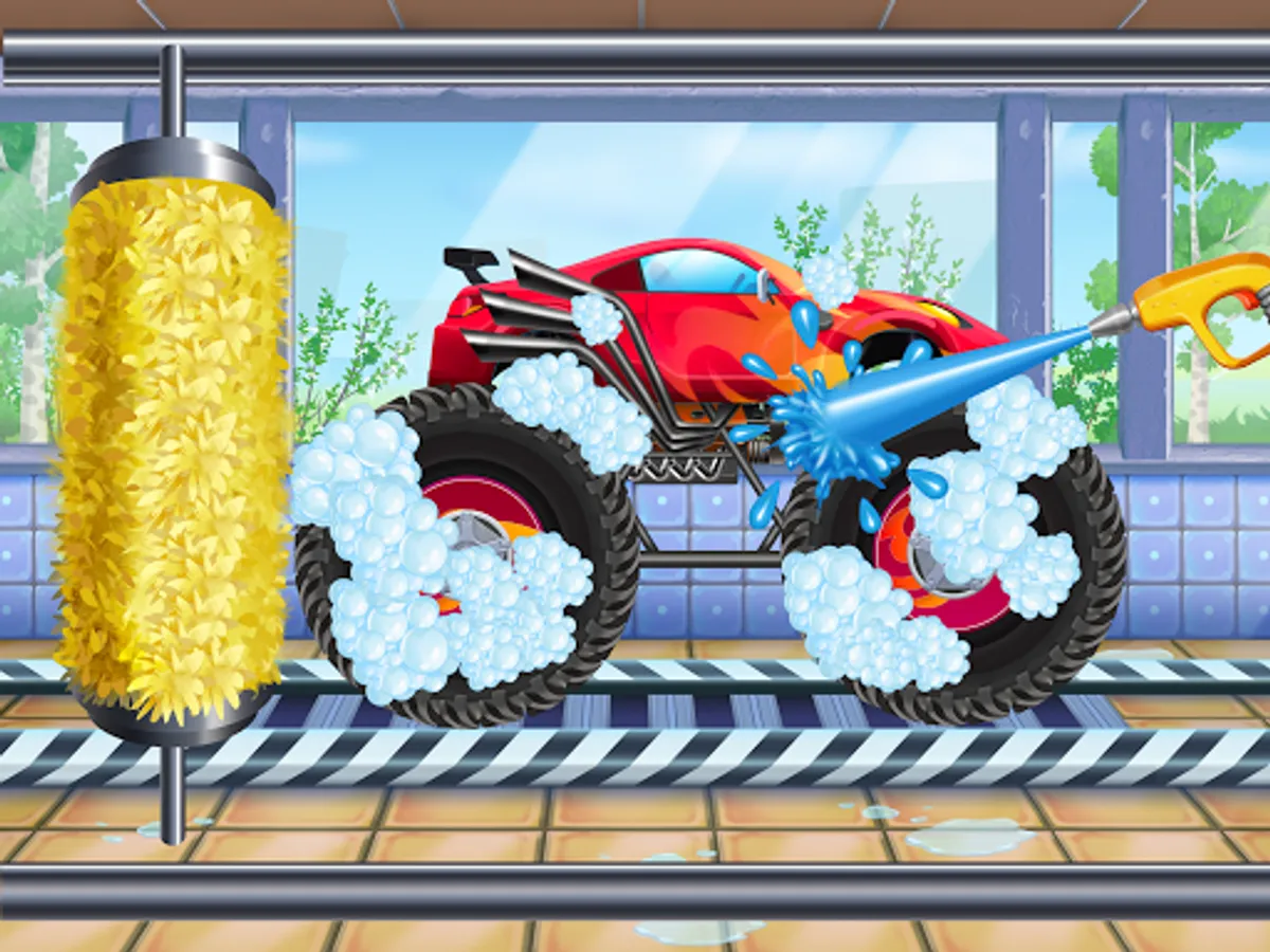 Your truck got dirty after the race? No problem! Go to a car wash, soap the car with bubbles, wipe it all over with a soft brush, and clean with water. Now your monster car is ready for the next competition!