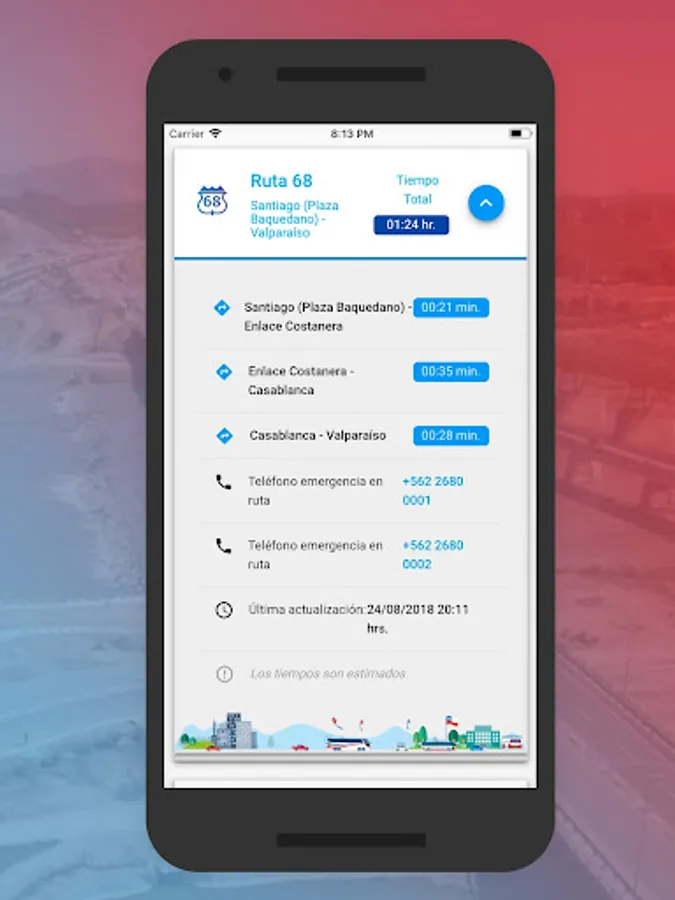 • Know the real time of transfer by vehicle to and from Santiago through the main routes.