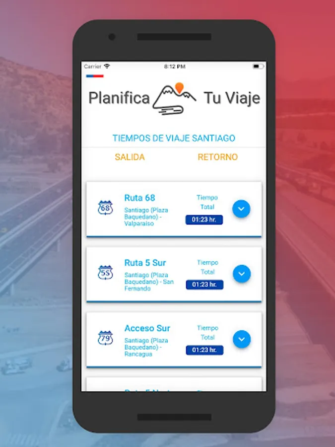 Plan your trip delivery the real time of transfer in vehicle of departure and return to Santiago by the main routes of our country.