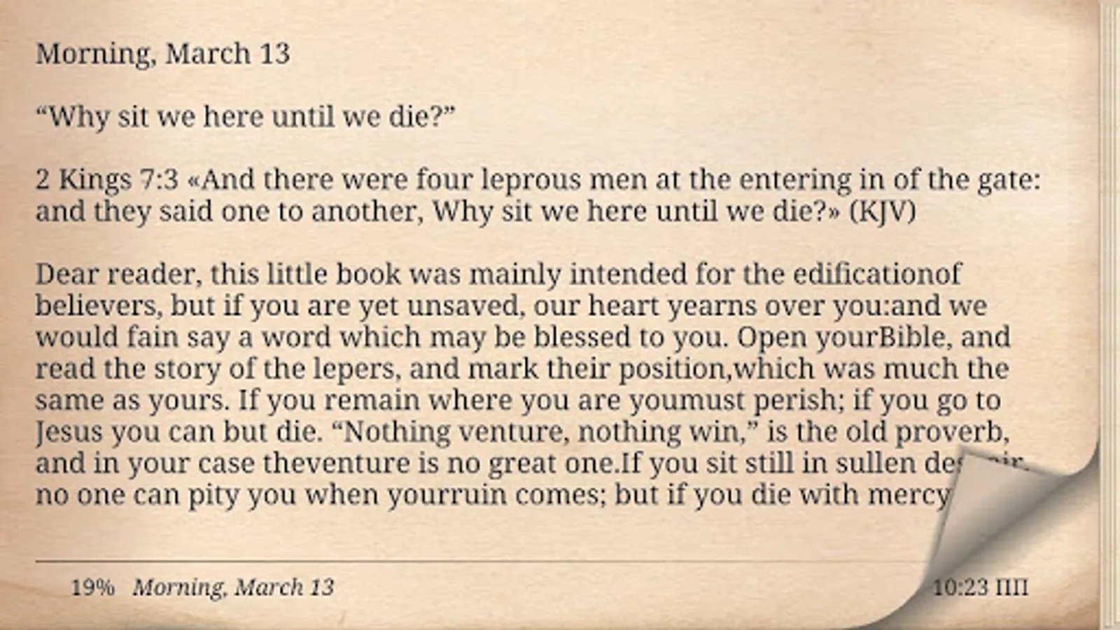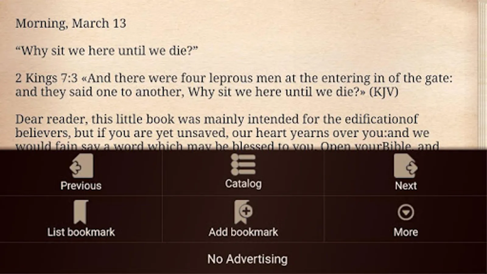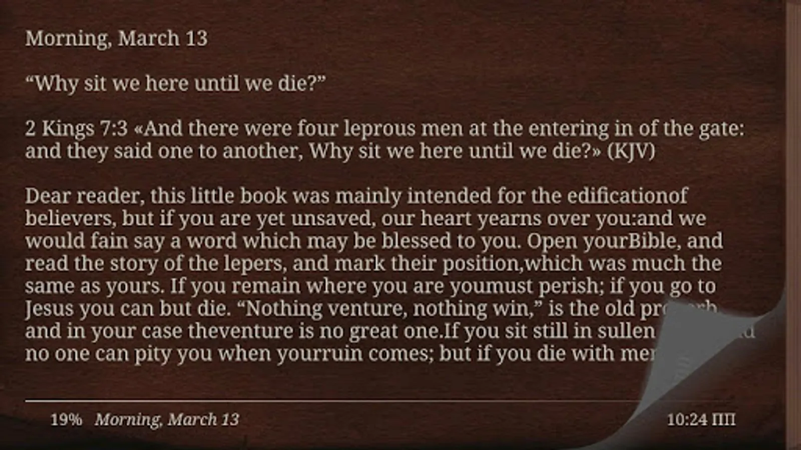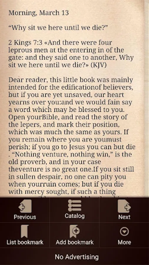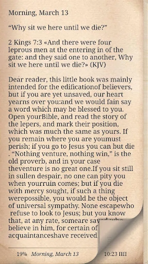 Thousands of Christians have gotten up and gone to bed with Charles Spurgeon's devotional Morning and Evening. Seven hundred and thirty two devotions. One for each morning and each evening. These devotions will guide you in a closer walk with God, helping you find a focus for each day.