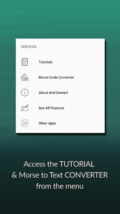 Easy to access the menu with Tutorial for the app. The menu also gives you access to the converter. Just type in your message to get the respective Morse code or enter the Morse code to decode the message.