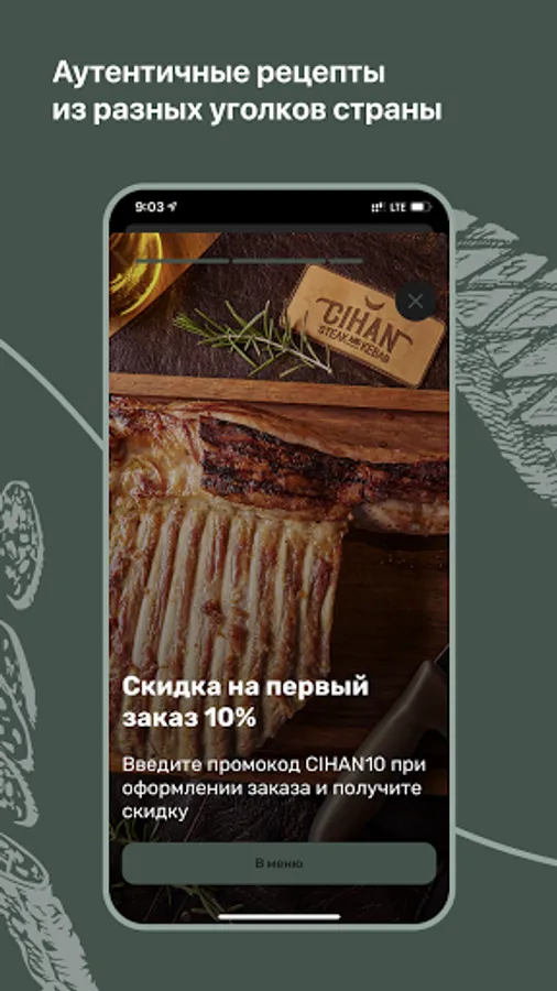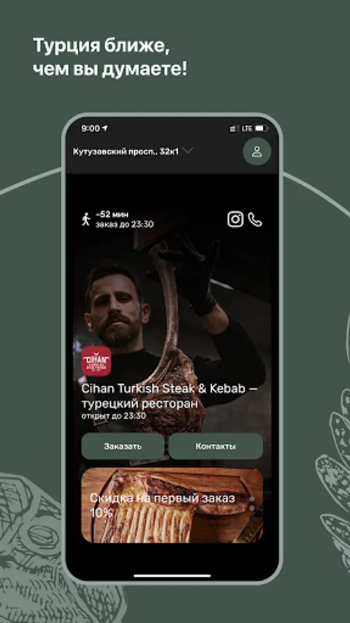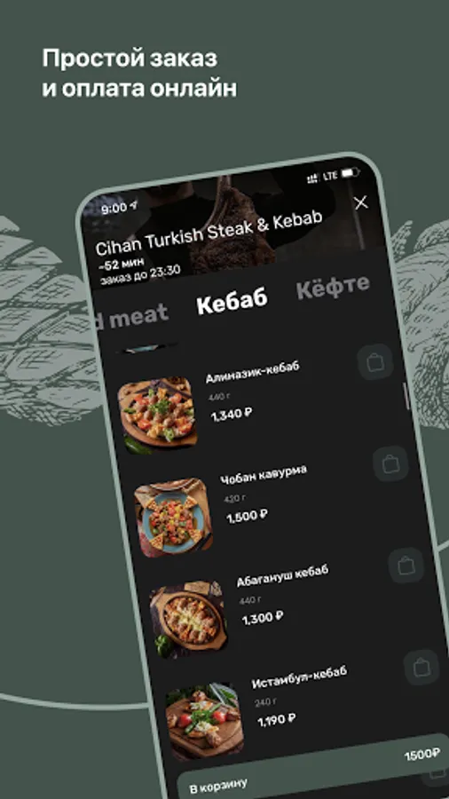In our application, you can place an online order. The menu includes steaks ranging from classic to alternative, and Wet Aged from our own aging cabinet, essential for Turkish cuisine minced meat kefte, charcoal dishes, meze with weightless cakes straight from tandoor and a dozen kebabs.