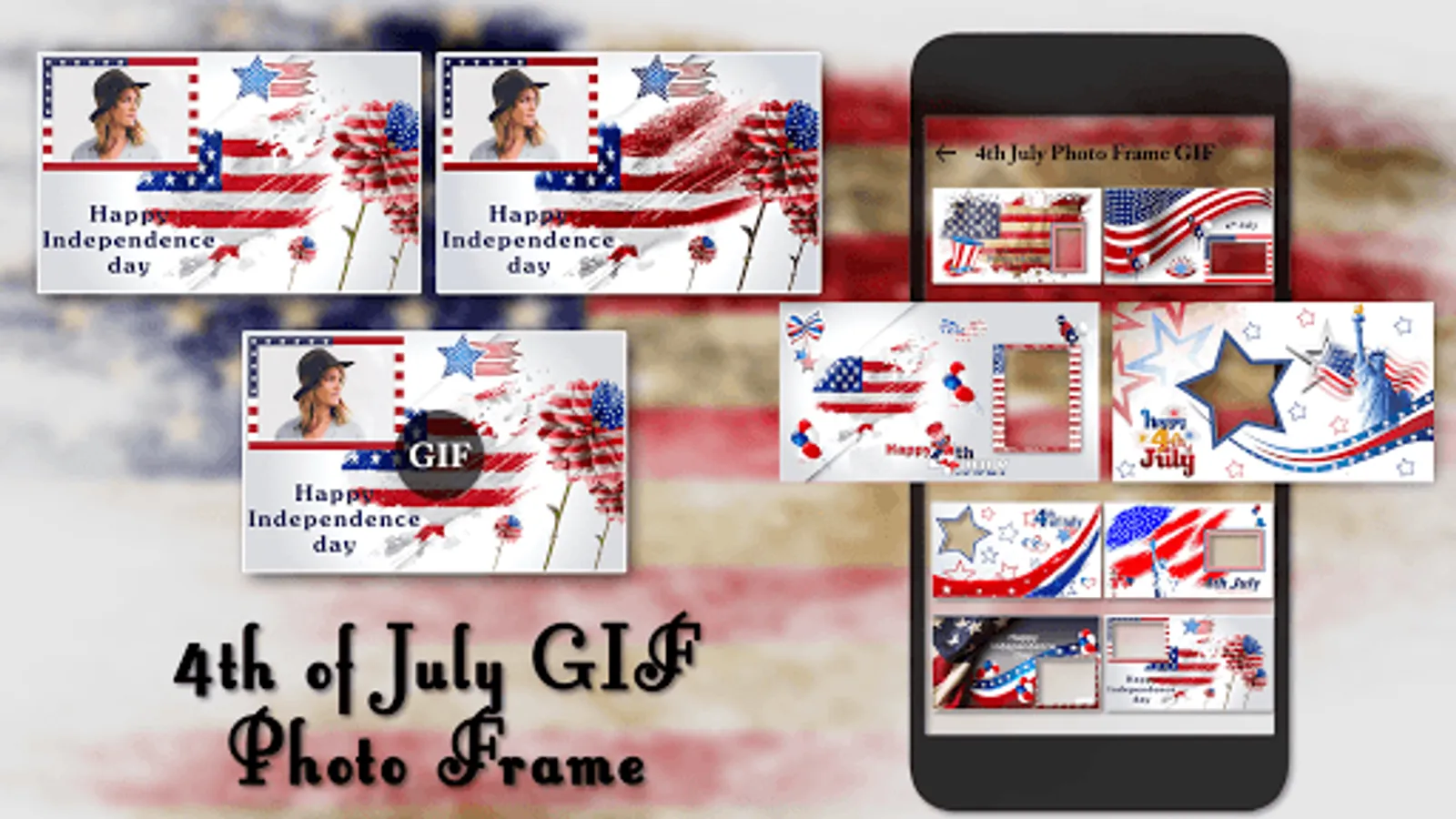 American Independence Day Photo Frame 2018 App provide the best collection of USA Independence Day photo frame / 4th of July photo Frames . Use this free app to create your own photo frames and GIF, to frame your memories and make them unforgettable.