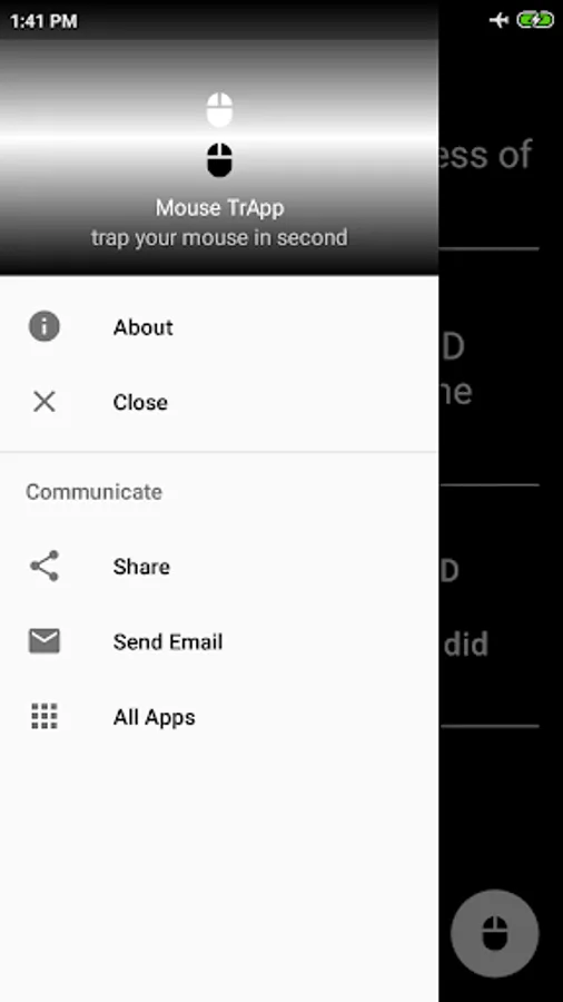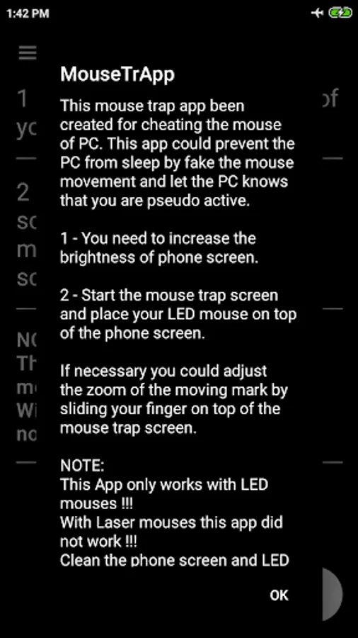This mouse trap app been created for cheating the mouse of PC. This app could prevent the PC from sleep by fake the mouse movement and let the PC knows that you are pseudo active.
