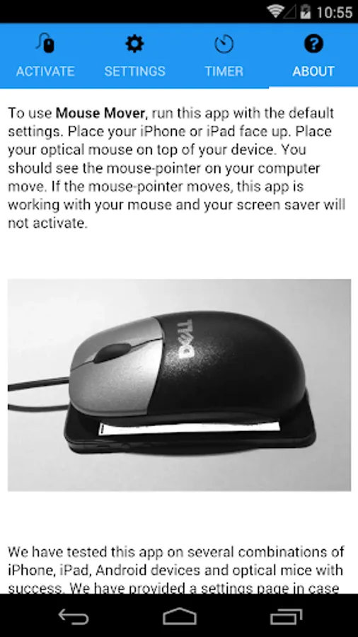 DO NOT CONNECT your device to your workstation. Just place your mouse over the app screen on your phone. The proprietary/patented imaging technology fools the mouse into thinking it is moving - deactivating the screen saver/lock screen. (You may need to experiment with the angle of the mouse.)