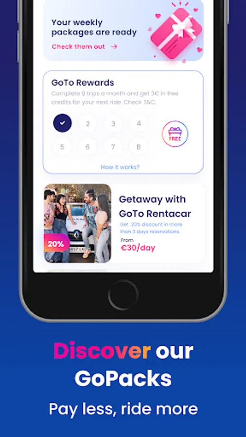 Travel more while paying less with our GoPacks and enjoy up to 40% off GoTo credits to rent a car.