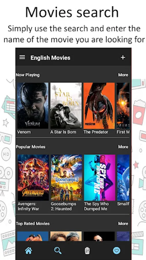 • Quickly search movies using the following categories: Now Playing movies, Upcoming movies, Popular movies, and Top Rated movies world wise