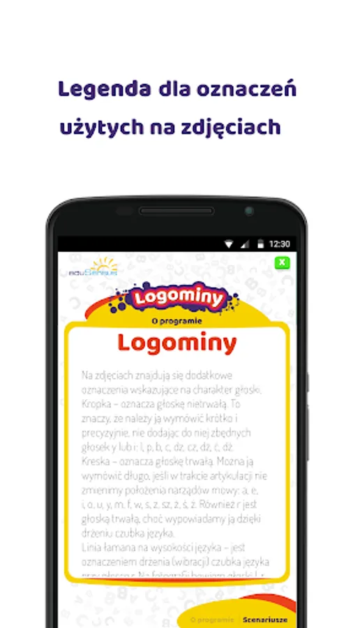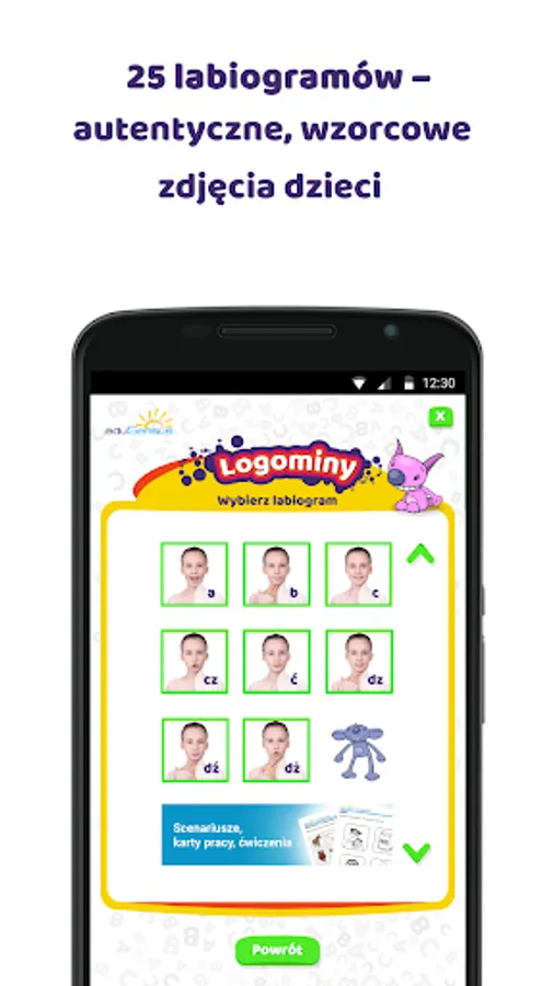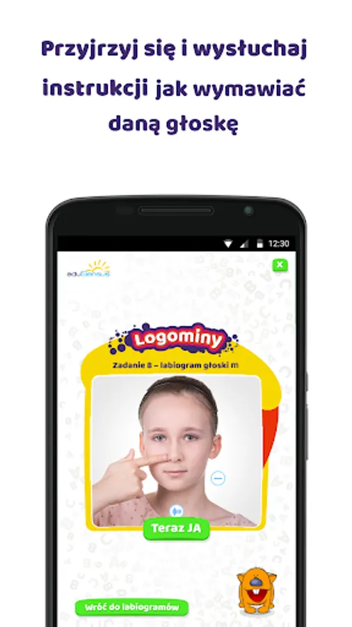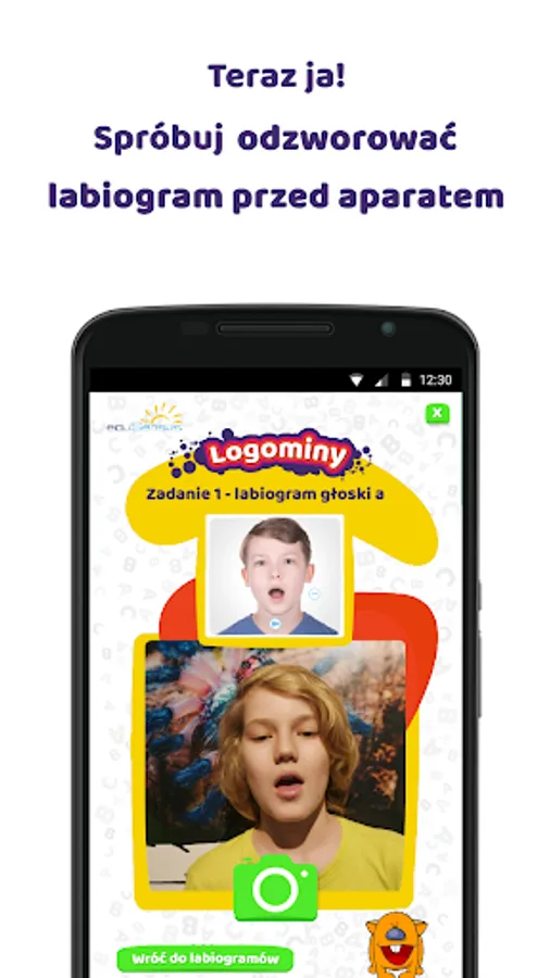 Thanks to the exercises performed with the Logominy application, we develop the child's articulation awareness (positioning of the lips, tongue, teeth when pronouncing sounds). The speech therapist can use the application in a creative way, offering a game, for example, guessing the sounds that the girl and the boy present in the photo. Each of the 25 boards is a task for the child to recreate the presented sound in front of the camera on a smartphone or tablet. The speech therapist finishing work with the application can save the photos taken during the session.