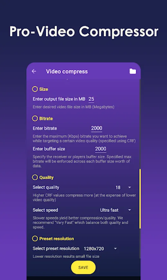 * Compress videos to small, medium, and normal quality.