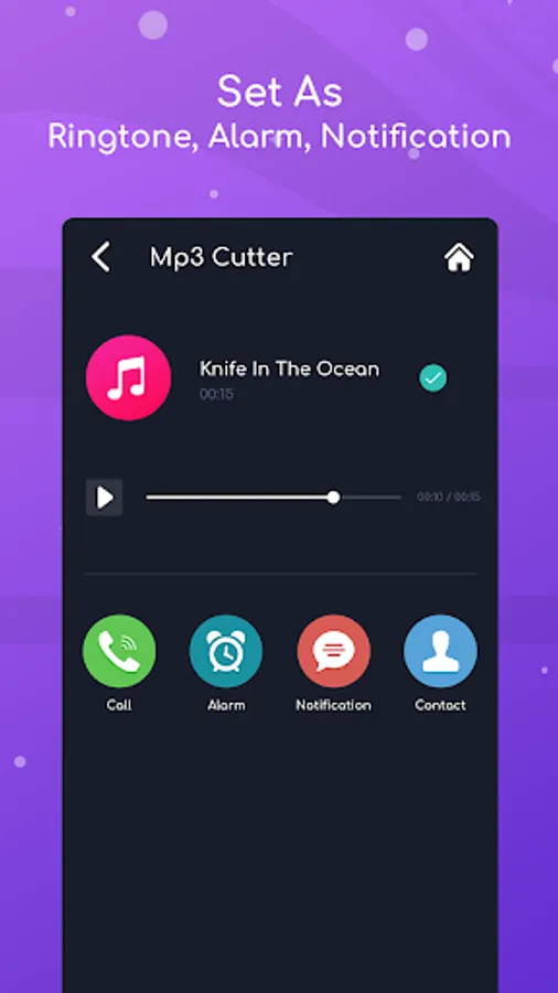 ✔ Set newly created ringtone or you can also apply ringtone to particular 📞 contact & 🔔 notification, ⏰ alarm tone.