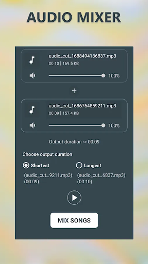 Choose your favorite mp3 music, adjust the volume to mix the two songs into your own output mp3 audio file and share the audio file to social media.