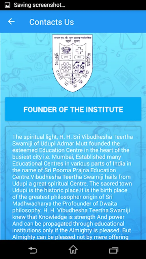 The spiritual light, H. H. Sri Vibudhesha Teertha Swamiji of Udupi Admar Mutt founded the esteemed Education Centre in the heart of the busiest city i.e. Mumbai, Established many Educational Centres in various parts of India in the name of Sri Poorna Prajna Education Centre.Vibudhesha Teertha Swamiji hails from Udupi a great spiritual Centre. The sacred town Udupi is the historic place.It is the birth place of the greatest philosopher origin of Sri Madhwacharya the Profounder of Dwaita philosophy. H. H. Vibudhesha Teertha Swamiji knew that Knowledge is strength And power And can be propagated through educational institutions only if the Almighty is pleased. But Almighty can be pleased not by mere offering puja/aarti to him instead we can please him through the service to the society by uplifting the downtrodden. Swamiji believed in selflessly serving the down trodden by establishing orphanage (hostels). Old age homes, etc.