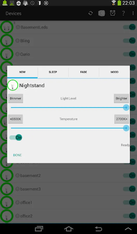 Use widgets on your home screen to directly switch your bulbs on, off, set brightness, set a sleep timer, or a fade timer. Assign your own images to the bulbs to create a custom home automation control panel assembled from widgets on your tablet.
