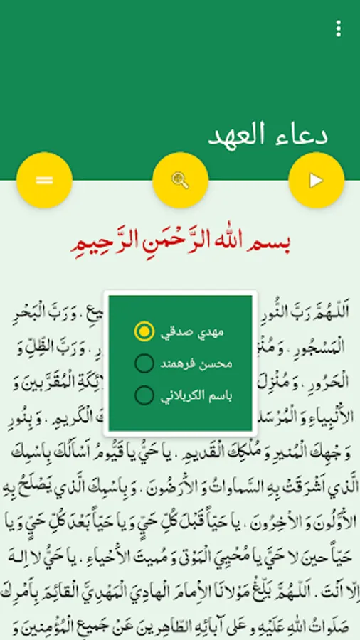 برنامج دعاء العهد بالكلمات و الصوت بدون انترنت بصوت كل من باسم الكرلائي ,محسن فرهمند و مهدي صدقي و اذا اردتم المزيد من الاصوات يمكن اضافنها
