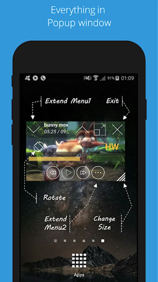 • Can start from external file managers with popup window mode, which is the most beneficial feature among video player apps.
