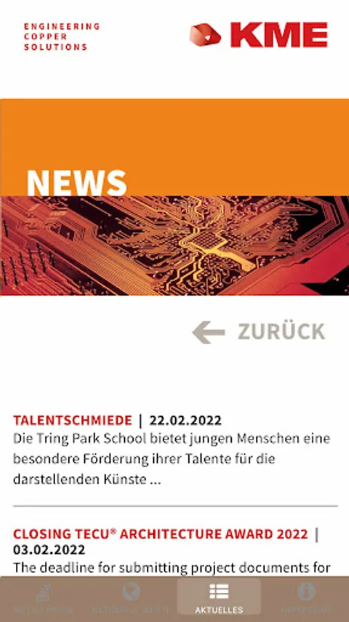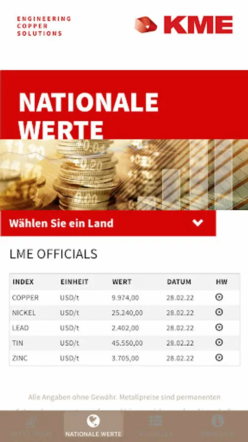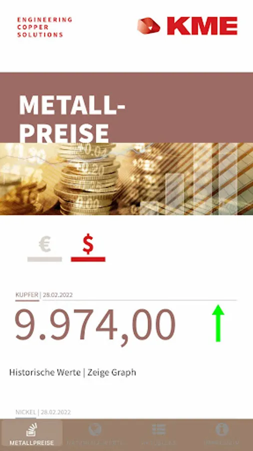 KME is one of the world's largest manufacturers of copper and copper alloy products and has a global sales network. The KME metal prices app provides you with information about current metal prices, KME events and news. The metal values are displayed according to LME quotations. As additional information, you can display the values in EUR, USD or in a diagram. The KME metal prices app is free. Metal prices are subject to constant fluctuations and can sometimes change drastically in a matter of minutes. The prices mentioned in this app are therefore of a purely statistical nature and should only be regarded as indications. All information is provided without warranty.