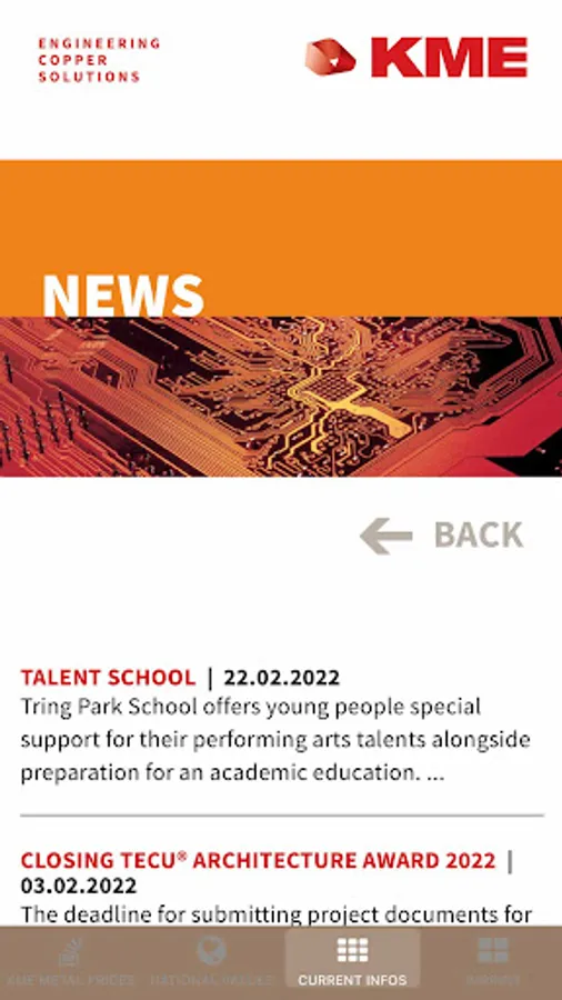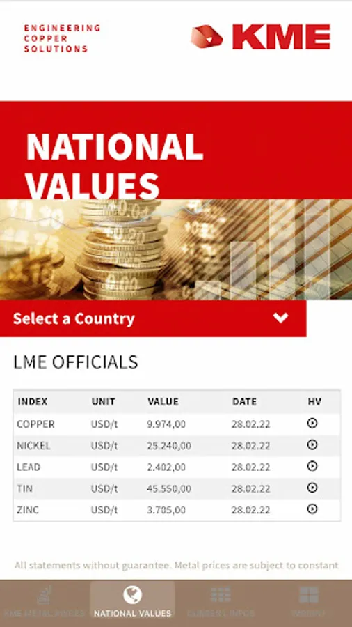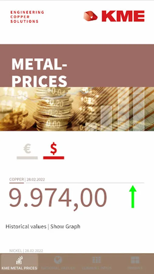 KME is one of the world's largest manufacturers of copper and copper alloy products and has a worldwide distribution network. Metal Prices by KME provides information about current metal prices, KME events and news. Values are displayed according to LME quotations. As additional information you can view the values in EUR, USD or in a graph. The App Metal Prices by KME is free of charge. Metal prices are subject to constant fluctuations and can sometimes change dramatically within minutes. Reference prices in this app are therefore to be considered only as indications of pure statistical nature. All statements without guarantee.