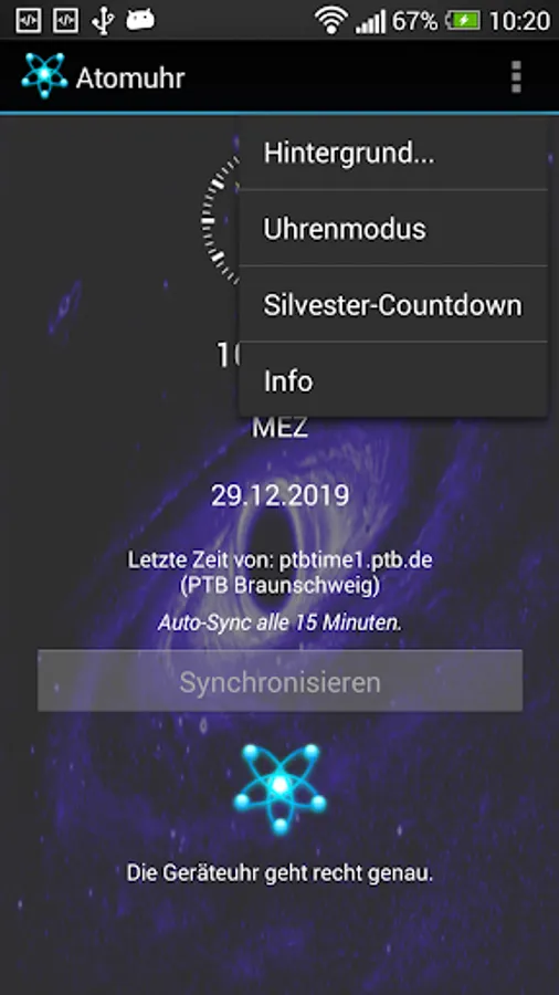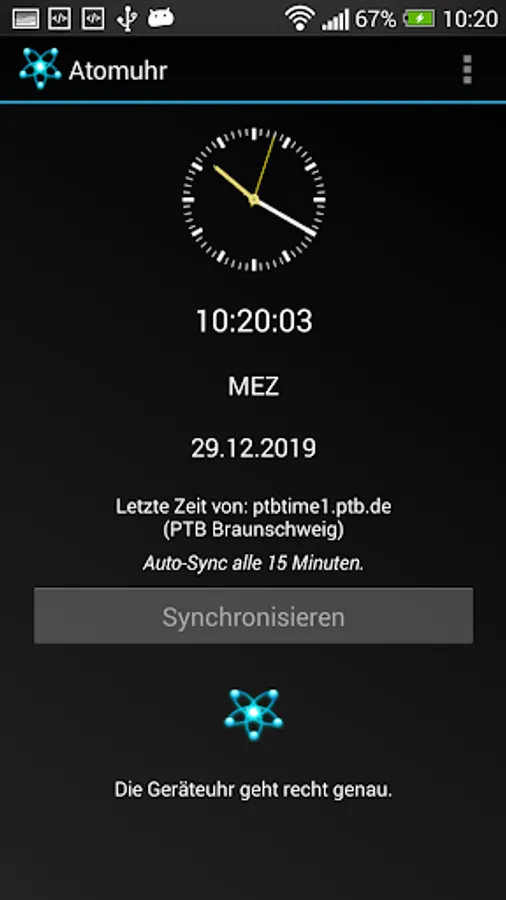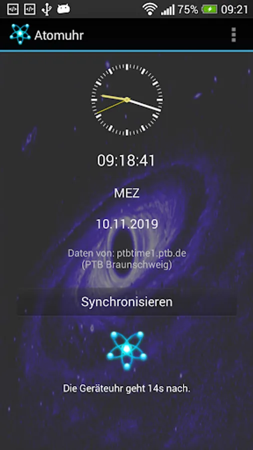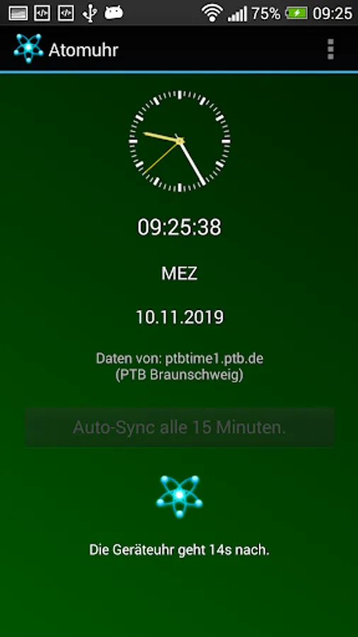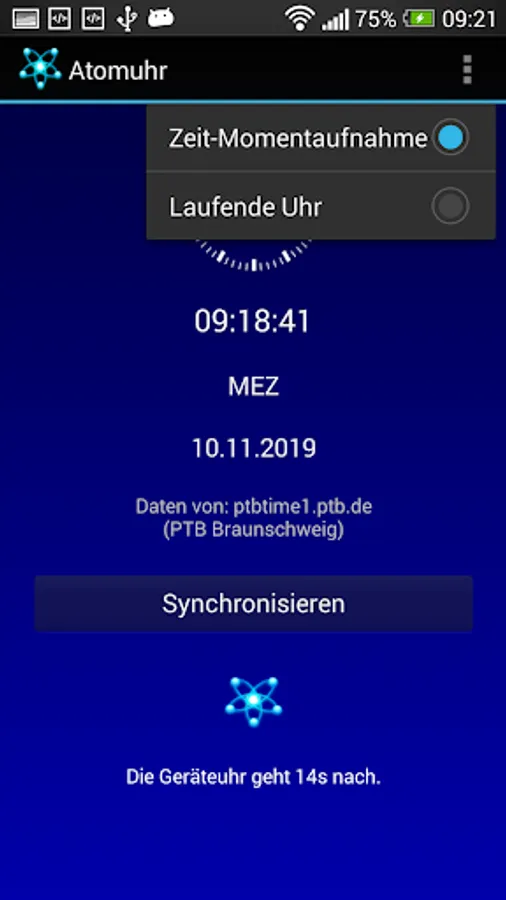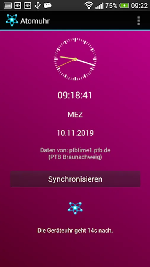 This app shows the current exact atomic time of PTB in Braunschweig. In addition, the deviation of the device time from the exact time is determined. And all this with a single click - no frills around it.